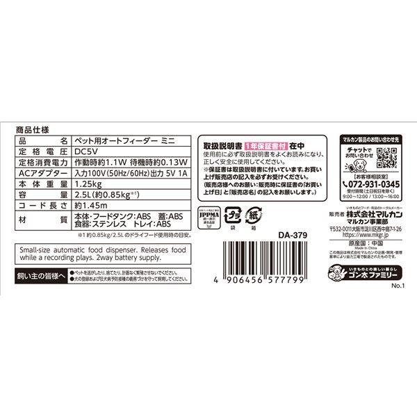 【商品名】 ペット用オートフィーダー ミニ (犬猫用品/食器) 【ジャンル・特徴】 おでかけ時に便利!自動給餌器 [ DA-379 ]"}