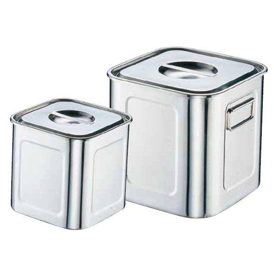 深型キッチンポットは、タレ入れ、食材入れとして厨房で活躍しています。角型なので厨房スペースを有効に活用できます。蓋が平らなので積み重ねができます。濡れた手でも取りやすい取っ手付の蓋は、水気を中に落とさない設計になっています。サイズが19.5cm以上には、写真右のように本体に取っ手が付きます。シリーズにはサイズが19種類ありますが、このページの商品は24cmです。