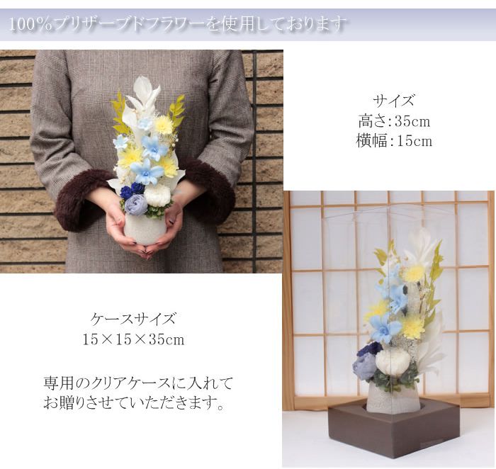 横:約15cm クリアケースサイズ W15cm×D15cm×H35cm メッセージカードについて ご希望の方には、メッセージカード、ラッピング、手提げ袋をサービス致します。定型分以外のメッセージをご希望するお客様は配送の備考欄にメッセージをお書きください。 対でご注文の方へ 対でご注文のお客様は数量を2にしてご注文をお願いいたします。 注意 ※プリザーブドフラワーは自然素材のため、色、形、大きさが画像と多少異なる場合があります。
