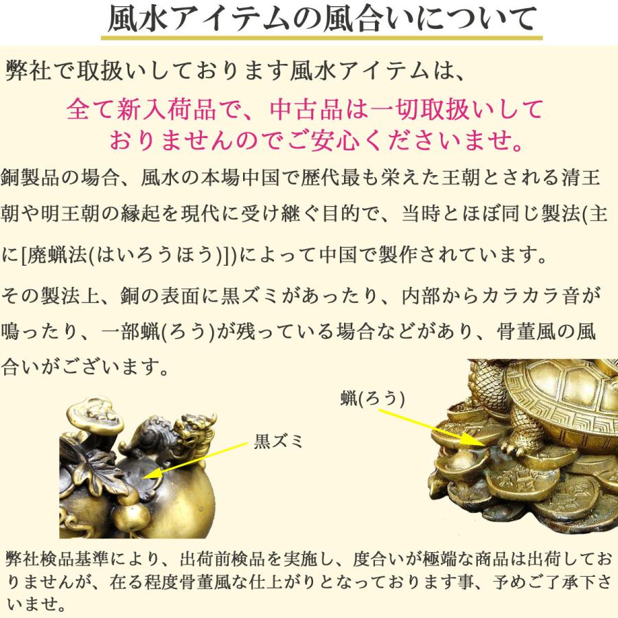 | いわずと知れた招財の高僧「布袋様」。七福神の一人でもあり、招財の縁起物として最適です。中国では、かなりの人気者!! 布袋さまの、この顔をみているだけで、笑顔になります☆ 願いを意の如く叶えてくれる宝物である“如意”を背負っています。 【布袋さまの祭り方】 1)縁起物の一般的な飾り場所としては、その家の顔である“玄関”か、家の中心を表す“床の間”(床の間が無い場合はリビングなど家族や来客などの人が集まる場所)が普通です。 2)次に金運・財運を招くには金庫や財布を置く場所もベター。 3)金色(銅製の商品)は西の方位に置くと良いです。 4)その他、出来れば置く場所は(生活する人間と同じ高さの)地面ではなく、一段高いところ(棚の上やコレクションボード・花台の上など)が良いとされています。 |