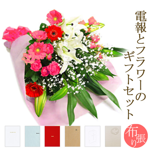 花束「ユリと季節の花束・ピンク系」と「布張りカード電報」のセット【主な用途】電報 祝電 お祝い電報 結婚式 誕生日 お祝い文例【大切な方へ贈るギフト】結婚祝い 結婚式 ウェディング ブライダル お誕生日 結婚記念日 銀婚式 金婚式 出産祝い 快気祝い 退院祝い お見舞い ギフト プレゼント 贈り物【季節のお祝いへ贈るギフト】お年賀 成人式 成人の日 バレンタインデー チョコ以外 ホワイトデー 合格 入学祝い 卒業祝い 就職 入学式 入園式 卒業式 卒園式 母の日 父の日 敬老の日 孫の日 クリスマス【ビジネスなどのお祝いギフト】開店祝い 開業祝い 開院 就任祝い 昇進 栄転 事務所移転 竣工式 落成式 送迎会 送別祝い 退職祝い 退官 選挙 当選 叙勲 褒章 受章 受賞 表彰 創立 周年 記念パーティー 出版 新築祝い 引越し祝い 発表会 演奏会 公演 楽屋見舞い【長寿のお祝いに贈るギフト】還暦祝い 古希 喜寿 傘寿 米寿 卒寿 白寿 百寿 賀寿 長寿祝い"}