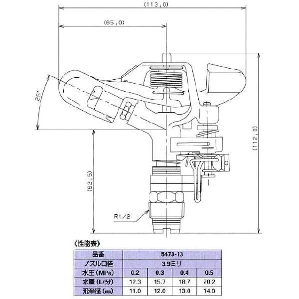 材質:黄銅パートサークル汎用スプリンクラー(拡散ピン付き)仰角25°、取付ネジR1/2材質:黄銅