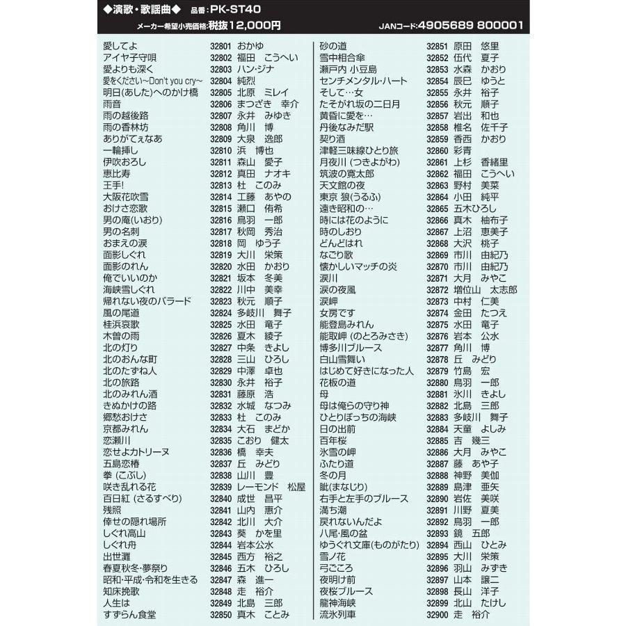 | パーソナルカラオケ オンステージ STシリーズ専用追加曲チップ 2020年発売曲中心 演歌・歌謡曲 100曲入り 【対応機種】 Z-PK1000/Z-PK1200G/Z-PK1200GT/Z-PK12GT/Z-PK10GT/Z-PK120WT/Z-PK121WT/PK-122WT/PK-100GT/PK-110GT/PK-XT01W/PK-111GT/PK-112GT/PK-113GT/PK-82/PK-84/PK-XA01W/PK-XA02W/PK-XA03W/PK-501WT/PK-FB01GT/PK-FA01 等 ※ご注意:本チップは旧製品(曲番号4桁表示)のSLE-PK500/SLE-PK1/Z-PK2/Z-PK3/Z-PK700/Z-PK30/Z-PK7000、またPK-Nシリーズ/PK-Wシリーズの本体ではご使用いただけません。 【曲目】 商品画像をご参照ください。 【付属品】 取扱説明書(保証書一体)、曲目リスト 【輸入・発売元】 佐藤商事株式会社 お客様相談窓口TEL:0120-310-750 ・オン・ステージとは: 中村泰士先生監修 パーソナルカラオケ「オンステージ (ON STAGE)」は、テレビに接続するだけで、誰でも・どこでも簡単にカラオケが楽しめる家庭用マイク型カラオケです。 ワイヤレス・ワイヤードと、お客様のご使用スタイルにあわせた機種を発売。各々の機種ともに、多様な内蔵曲と様々な機能を搭載した家庭用カラオケ「オン・ステージ」は、お年寄りからお子様まで、カラオケ初心者から上級者まで幅広いユーザーからご好評いただいております。 【収録曲】 32801 おかゆ 愛してよ 32802 福田こうへい アイヤ子守唄 32803 ハン・ジナ 愛よりも深く 32804 純烈 愛をください〜Don"t you cry〜 32805 北原ミレイ 明日(あした)へのかけ橋 32806 まつざき幸介 雨音 32807 永井みゆき 雨の越後路 32808 角川博 雨の香林坊 32809 大泉逸郎 ありがてぇなあ 32810 浜博也 一輪挿し 32811 森山愛子 伊吹おろし 32812 真田ナオキ 恵比寿 32813 杜このみ 王手! 32814 工藤あやの 大阪花吹雪 32815 瀬口侑希 おけさ恋歌 32816 鳥羽一郎 男の庵(いおり) 32817 秋岡秀治 男の名刺 32818 岡ゆう子 おまえの涙 32819 大川栄策 面影しぐれ 32820 水田かおり 面影のれん 32821 坂本冬美 俺でいいのか 32822 川中美幸 海峡雪しぐれ 32823 秋元順子 帰れない夜のバラード 32824 多岐川舞子 風の尾道 32825 水田竜子 桂浜哀歌 32826 夏木綾子 木曽の雨 32827 中条きよし 北の灯り 32828 三山ひろし 北のおんな町 32829 中澤卓也 北のたずね人 32830 永井裕子 北の旅路 32831 藤原浩 北のみれん酒 32832 水城なつみ きぬかけの路 32833 杜このみ 郷愁おけさ 32834 大石まどか 京都みれん 32835 こおり健太 恋瀬川 32836 橋幸夫 恋せよカトリーヌ 32837 丘みどり 五島恋椿 32838 山川豊 拳 (こぶし) 32839 レーモンド松屋 咲き乱れる花 32840 成世昌平 百日紅 (さるすべり) 32841 山内惠介 残照 32842 北川大介 倖せの隠れ場所 32843 葵かを里 しぐれ高山 32844 岩本公水 しぐれ舟 32845 西方裕之 出世灘 32846 五木ひろし 春夏秋冬・夢祭り 32847 森進一 昭和・平成・令和を生きる 32848 走裕介 知床挽歌 32849 北島三郎 人生は 32850 真木ことみ すずらん食堂 32851 原田悠里 砂の道 32852 伍代夏子 雪中相合傘 32853 水森かおり 瀬戸内 小豆島 32854 辰巳ゆうと センチメンタル・ハート 32855 永井裕子 そして…女 32856 秋元順子 たそがれ坂の二日月 32857 岩出和也 黄昏に愛を… 32858 椎名佐千子 丹後なみだ駅 32859 香西かおり 契り酒 32860 彩青 津軽三味線ひとり旅 32861 上杉香緒里 月夜川 (つきよがわ) 32862 福田こうへい 筑波の寛太郎 32863 野村美菜 天文館の夜 32864 小田純平 東京 狼(うるふ) 32865 五木ひろし 遠き昭和の… 32866 真木柚布子 時には花のように 32867 上沼恵美子 時のしおり 32868 大沢桃子 どんどはれ 32869 市川由紀乃 なごり歌 32870 市川由紀乃 懐かしいマッチの炎 32871 大月みやこ 涙川 32872 増位山太志郎 涙の夜風 32873 中村仁美 涙岬 32874 金田たつえ 女房です 32875 水田竜子 能登島みれん 32876 岩本公水 能取岬 (のとろみさき) 32877 角川博 博多川ブルース 32878 丘みどり 白山雪舞い 32879 竹島宏 はじめて好きになった人 32880 鳥羽一郎 花板の道 32881 氷川きよし 母 32882 北島三郎 母は俺らの守り神 32883 多岐川舞子 ひとりぼっちの海峡 32884 天童よしみ 日の出前 32885 吉幾三 百年桜 32886 大月みやこ 氷雪の岬 32887 藤あや子 ふたり道 32888 神野美伽 冬の月 32889 島津亜矢 眦(まなじり) 32890 岩佐美咲 右手と左手のブルース 32891 川野夏美 満ち潮 32892 鳥羽一郎 戻れないんだよ 32893 鏡五郎 八尾・風の盆 32894 西山ひとみ ゆうぐれ文庫(ものがたり) 32895 大川栄策 雪ノ花 32896 羽山みずき 弓ごころ 32897 山本譲二 夜明け前 32898 長山洋子 夜桜ブルース 32899 北山たけし 龍神海峡 32900 走裕介 流氷列車 タグ:PKST40 パーソナルカラオケオンステージ 追加チップ 別売追加曲チップ パーソナルカラオケ曲チップ onstage 家庭用カラオケマシン おうちカラオケ おうちからおけ TVに繋いでお家でカラオケ! 自宅 練習 一人カラオケ ひとりカラオケ ヒトカラ ひとカラ ワンカラ 昼カラ 昼カラオケ |