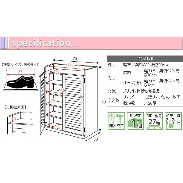 風通しの良い本格ルーバー扉を採用したシューズボックスです。サイズ:W75×D33×H90cm推奨シューズサイズ:27cm以下(約20足目安)※デザインによって収納数に差があります。素材:プリント紙化粧繊維板梱包数:1個(27kg)お客様組立て商品 ※プラスドライバーが必要です"}