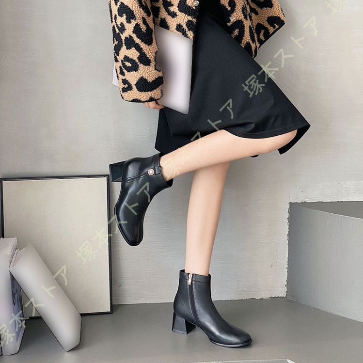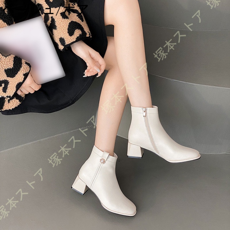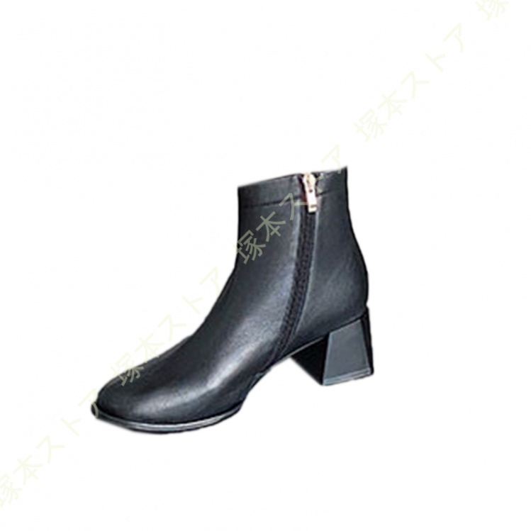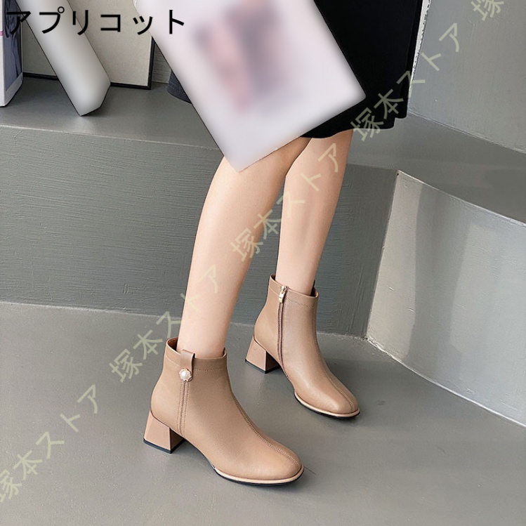 レディース ショートブーツ ブーティー 太ヒール チャンキーヒール ストレッチ 弾力性 サイドジッパー ジップアップ スクエアトゥ 美脚 滑り止め 通勤