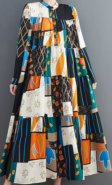 ワンピース ロング ミモレ丈 長袖 秋冬 レディース 大きいサイズ ティアードワンピース フレアワンピ バンドカラー パッチワーク風 柄物 カラフル 華やか カジュアル 休日コーデ ブラック ホワイト オレンジ ファッション/[okr68]誰もが目を惹くおしゃれな装いに。 ティアードデザインがレディさをプラス。 ゆったり着れるシルエットで体型カバーも◎ 1枚で決まるこだわりスタイルが叶います。 周りと被らないワンピをお探しの方に。 ちょっとしたお出かけやデイリーコーデに。
