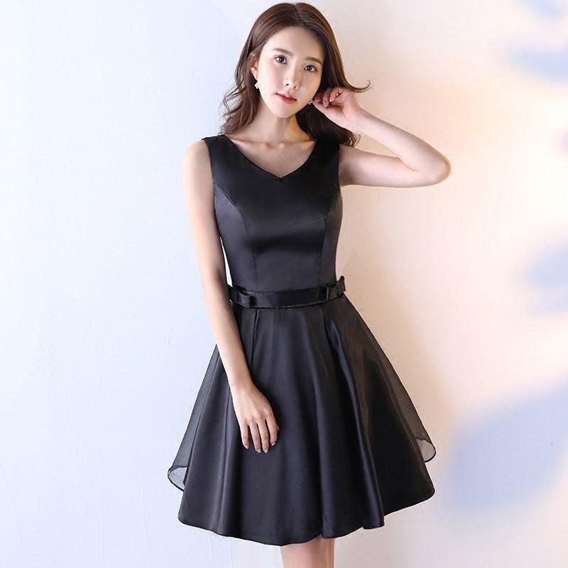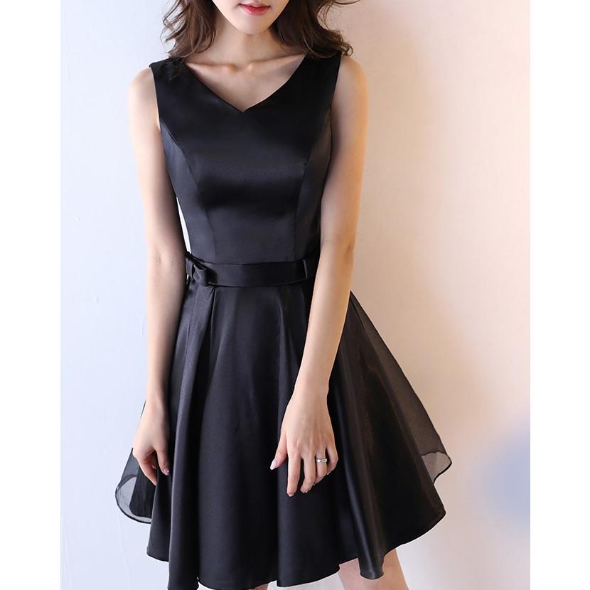 パーティードレス 黒 ミニ ウエストリボン レディース ドレス Vネック ノースリーブ フレアスカート 大きいサイズ 3L 小さいサイズ 結婚式 二次会 お呼ばれ
