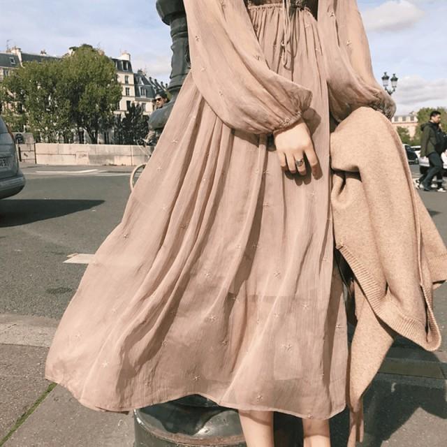 ロングワンピース シフォン ゆったり ヘンリーネック 長袖 星柄 刺繍 リボンタイ レディース ワンピース マキシ丈 体型カバー お出かけ 春夏