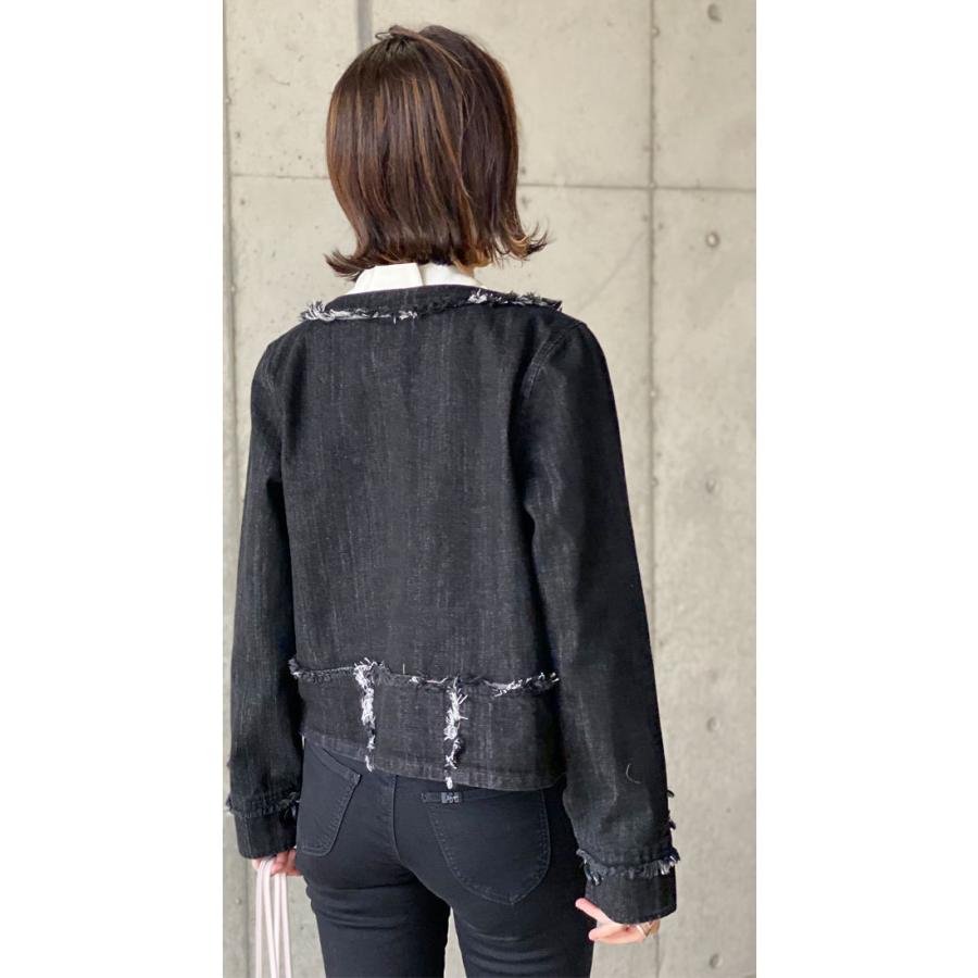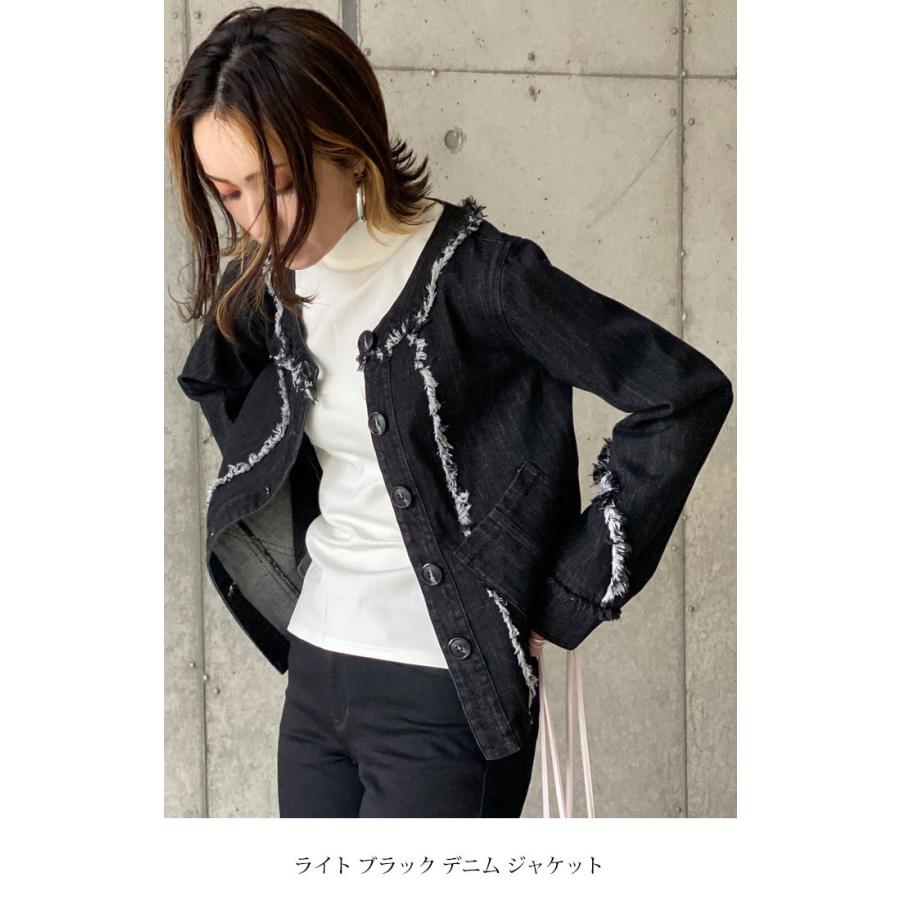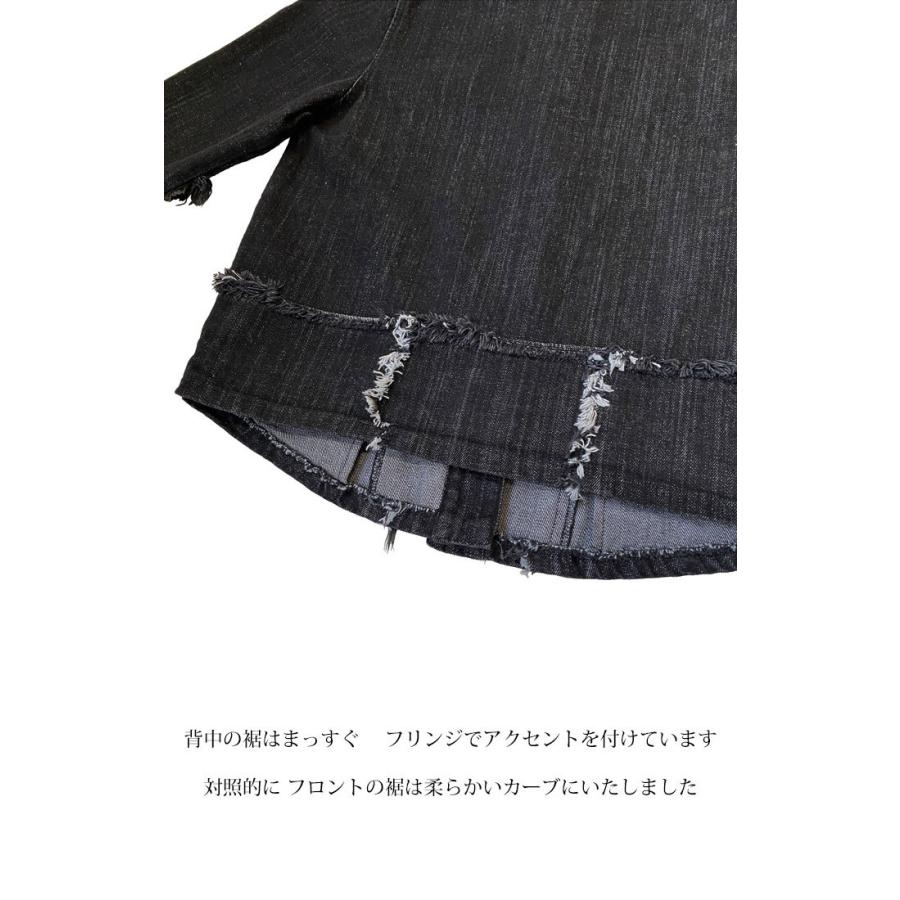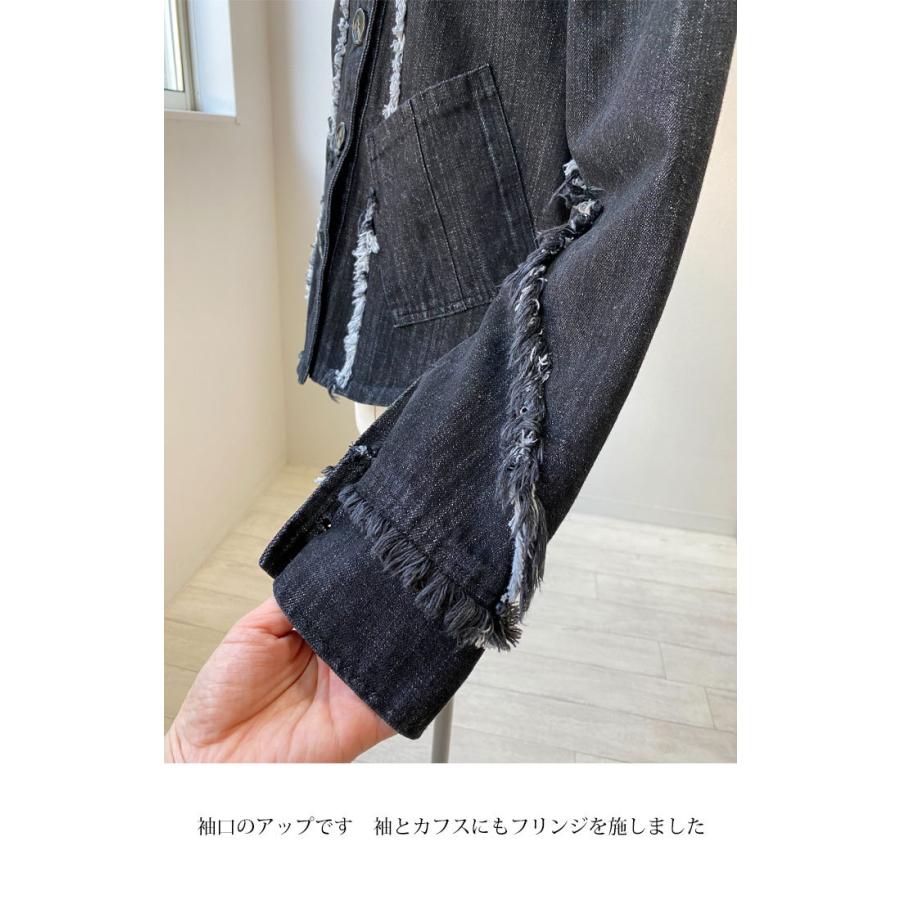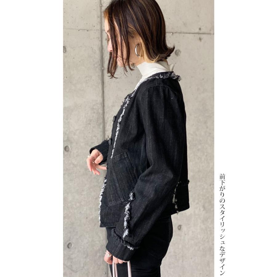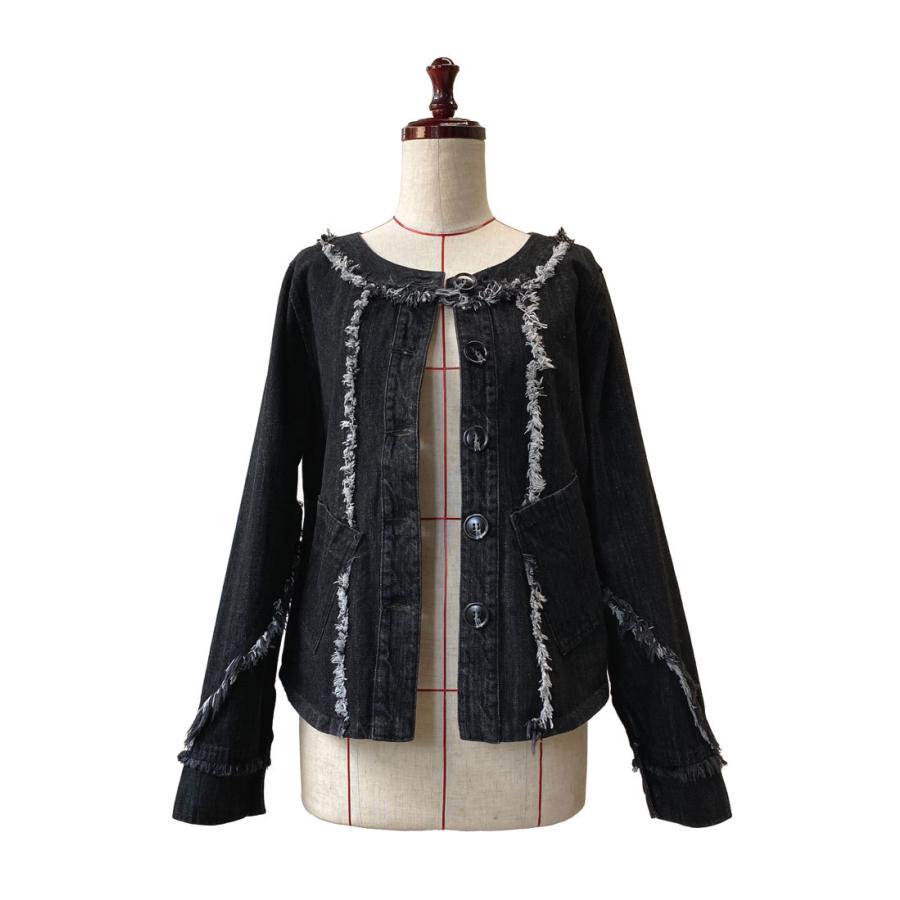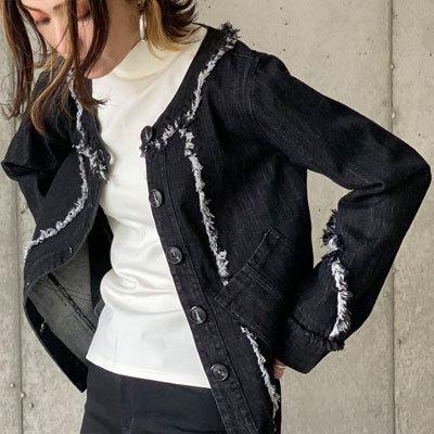 ライトブラック デニムジャケット コットン 万能ジャケット フリンジ スタイルアップ 映え こなれ感 ブラックデニム レディースファッション アウター