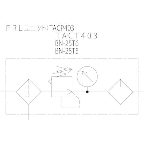 空圧用品 空圧・油圧機器 エアユニット ●エアフィルター、レギュレーター、ルブリケータを専用アタッチメントでコンパクトに接続したユニットです。●ろ過精度(μm):5●使用圧力(MPa):0.05〜1.0●処理空気流量([[M3]]/min):1.5●接続口径:Rc1/2●貯油量([[CM3]]):200●全長(mm):215●全幅(mm):230●設定圧力(MPa):0.1〜0.85●ドレン排出方法:手動(ただし圧力が0.05MPa以下になると自動で排出)●使用流体:空気●流体温度(℃):5〜60●使用油:タービン油1種(ISO VG#32相当)●圧力計、ブラケット付空圧用品 空圧・油圧機器 エアユニット TRUSCO TACT403-15 4500