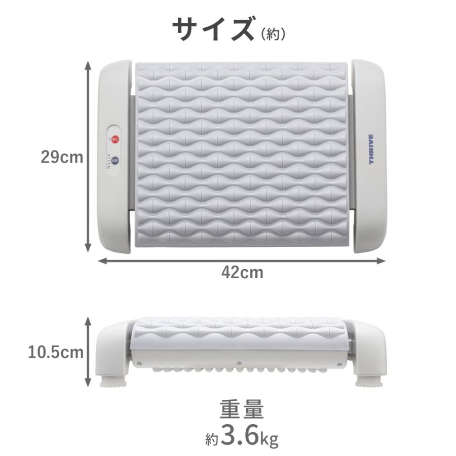 THRIVE マッサージャー MD-1850【商品詳細】サイズ:(約)幅42×奥行29×高さ10.5cm重量:約3.6kg材質:上振動板/EVA樹脂、下振動板・サイドアーチ/ABS樹脂振動回数:約2150〜2900回/分定格時間:20分オートタイマー:約10分定格:AC100V 50/60Hz 41W電源コード長さ:約2m医療機器認証番号:303AHBZX00021000【商品説明】■上下で異なる振動版を採用する事で、座って足裏だけでなく、太ももや手など様々な部位のマッサージが可能。■サイドアーチ部に高さを持たせ、床面設置部には合成ゴムを付けている為、床に振動を与えにくい静音設計。■自動コースは4種類から速度選択が可能。関連ワード父の日 敬老の日 健康グッズ 母の日 おすすめ オススメ プレゼント ギフト 贈物 贈り物 誕生日 便利 便利グッズ 便利アイテム グッズ アイテム 人気ランキング 人気 ランキング