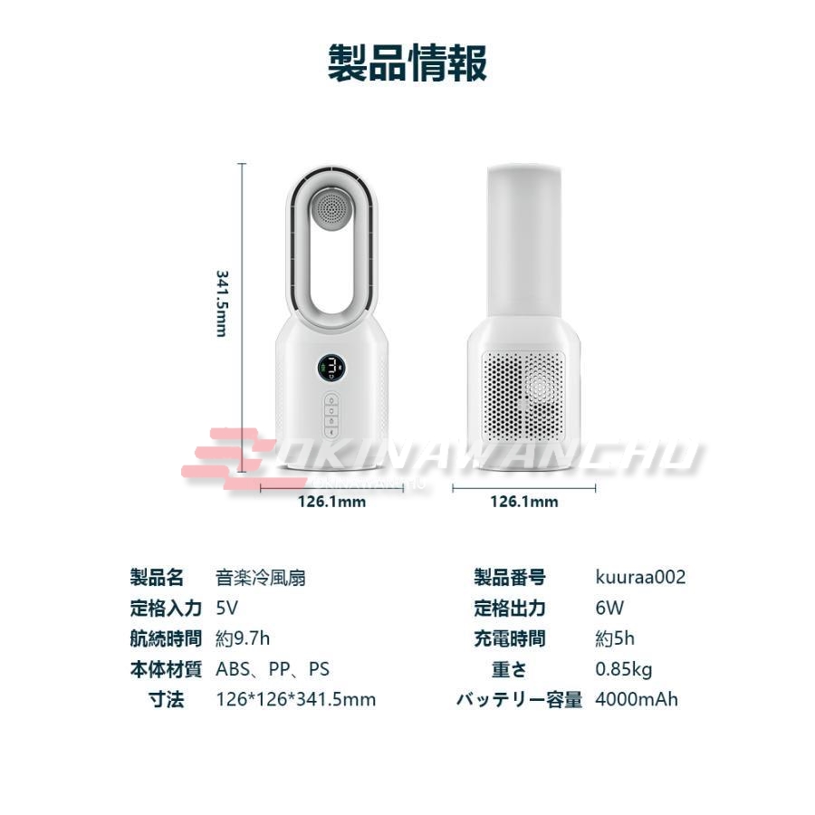 商品情?商品名 音楽冷風扇商品番号 kuuraa002商品寸法 126*126*341.5mm商品重さ 0.85kgバッテリ容量 4000mAh定格入力 5V定格出力 6WPSE認証 認証済み高安全性・お手入れ簡単の羽根なし扇風機羽なし扇風機はファンがむき出しになっていないため、髪の毛を巻き込んだり、指を入れて怪我をする心配がありません。小さな子どもやペットがいる家庭でも、安心して扇風機を使用できます。頻繁に使用している夏の時期なら、少なくとも1ヶ月に1度の掃除する。携帯扇風機この携帯扇風機しいトレンドを導く半導体冷却交換技術を採用し、接触瞬間超冷感、体感温度が-12℃下がります。冷却部を頬に当ててください、快適な冷感を瞬間感じます。今年の猛暑に欠かせないアイテムです。低騒音&省スペースこのテーブルファンは低騒音(40dB以下)、積極的な吸気で動作し、フロントグリルから強制的に吸気され、修復のための適切な量のホワイトノイズで、静かで涼しい流水が得られます。"}