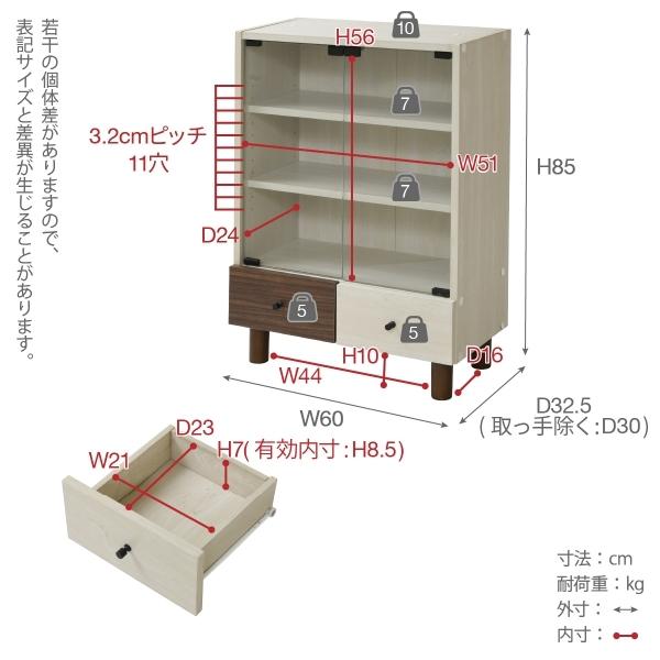 ■商品説明 木目のあるナチュラル×ダークブラウンのツートーンで、ちょっぴりレトロな大人可愛いガラス扉×チェスト。ガラス扉にはお気に入りの小物や雑誌などを並べれば「見せる収納」として楽しめます。中は可動棚なので収納物に合わせて高さを調節できます。こまごましたものは引き出しに入れて見た目スッキリ!同じシリーズ商品と組み合わせることで、お部屋に合わせたレイアウトとオリジナル収納を実現できます。■本体サイズ [外寸]幅60×奥行32.5×高さ85cm■組立時間(目安)(大人2人) お客様組立(40分)■キーワード リビングボード おしゃれ 北欧 小さい スリム 北欧風 小さめ 脚付き 脚 薄型 かわいい サイドボード 棚 ナチュラルカントリー 低め 低い フィギュア 本棚 マガジンラック ロータイプ ガラス戸 雑貨 ブラウン ベッドサイド ベージュ 茶色 透明 本 シェルフ ガラス扉付き 収納棚 ディスプレイラック ガラスキャビネット 飾り棚 リビング収納 オシャレ 棚付き 北欧モダン ラック リビングキャビネット 新生活 シンプル
