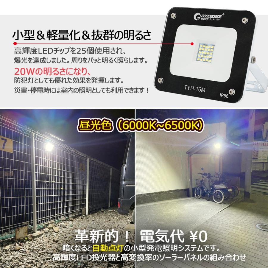 SALE GOODGOODS ソーラーライト 屋外 明るい ガーデンライト LED投光器 充電式 20W ソーラー投光器 薄型 電池交換式 昼光色 庭園灯 防災グッズ TYH-16M-N