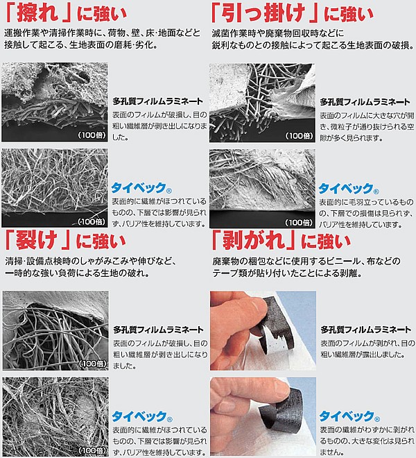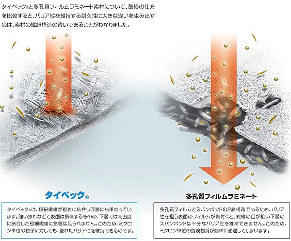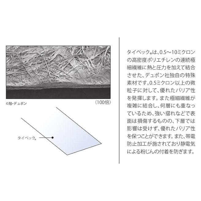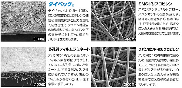 | タイベックは0.5〜10ミクロンの高密度ポリエチレンの連続極細繊維に熱と圧力を加えて結合させた、デュポン社独自の特殊素材です。0.5ミクロン以上の微粒子に対して、優れたバリア性を発揮します。また極細繊維が複雑に結合し、何層にも重なっているため、強い摺れ等で表面は損傷するものの、下層では影響は受けず、優れたバリア性を保つことができます。また、帯電防止加工が施されており静電気による粉じんの付着も防ぎます。 抜群のバリア性 極細連続長繊維から作られていますので、細かい粒子にたいし優れたバリア性を発揮します。 耐久性 極めて丈夫で、引き裂き強さ、摩擦強さも備えています。過酷な条件下でも、一貫した性能を維持し、防護レベルを確保します。作業中、防護服の表面が壁や器具などに接触して磨耗することがよくあります。タイベックソフトウェアにはこのような摩擦した後でもバリア性はほとんど変わりません。 快適性 空気および水蒸気を透過し、繊維の「呼吸」を維持します。また、極めて軽く、ソフトで柔軟性にほとんど変わりません。 低発塵性 連続長繊維でできているので、発塵はほぼゼロです。 不純物混入なし 純粋な高密度ポリエチレンから作られており、充填剤や結合剤、シリコンなどを含んでいません。したがって、固有の不純物は入っておりません。 帯電性 両面とも帯電防止加工済みですので、防護服が適当にアースされていれば、強力な電荷からも安全に保たれます。 反発性・撥水性 極めて滑らかな表面をもち、無機の液体を寄せ付けず、固体粒子の付着を防ぎます。 用途 感染対策 放射性粉じん対策(除染作業含む) 焼却炉の解体メンテナンス作業 アスベスト除去 ダイオキシン PCB 製薬製造 農薬散布 汚れ作業 塗装関係 食品加工 医療関連 畜産関係 石油化学産業 廃棄物の取扱い |