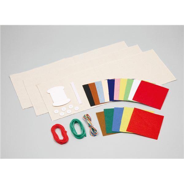 帆布生地(180×460mm)×3 フェルトシール10枚組(100×100×1mm)×1セット フェルト5色組[黄・赤・青・緑・茶](100×100×1mm)×1セット マジックテープ(10×100mm)×1 ひも[赤・緑](φ2mm×1m)×1セット 四つ穴ボタン(φ15mm)×6 縫い糸(白 10m)×1 ししゅう糸5色組[黄・赤・白・緑・水](1m)×1セット