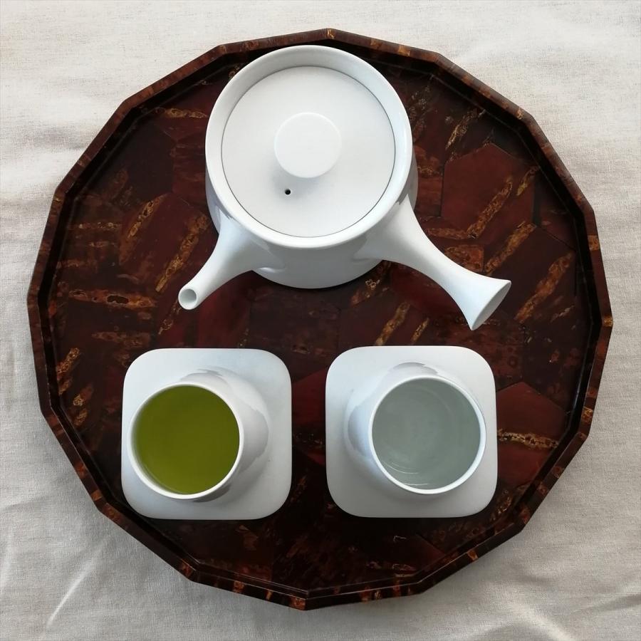 樺細工 冨岡商店の「16角盆 亀甲」です。縦・横共に30cmと、少人数のおもてなしシーンに活躍する最適なサイズのトレイです。十六角形の木地に亀甲形の桜皮(山桜の樹皮)をモザイクのように貼り付けたユニークな意匠。ウレタン樹脂塗装なのでお手入れも簡単です。※商品の性質上、色彩・柄・形状等が多少異なる場合がございます。