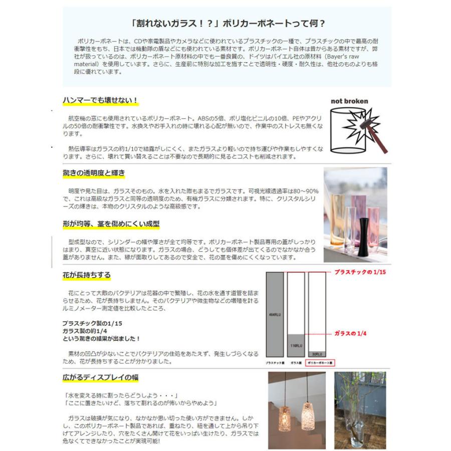 見た目はどこからどう見てもガラス。でもガラスじゃないからハンマーで叩いても割れない!壊れない!万能、優秀なフラワーベースです。破損のケガや心配がないので、小さなお子様やペットがいるご家庭でも安心してご使用いただけます。クリスタルグラスのような透明感がとても綺麗なのも特徴。また、雑菌の繁殖が通常の花瓶に比べて少ないので、お花が長持ち!ギフトにもご自分用としても喜ばれること間違いなしの大人気の花瓶です。ポリカーボネートは最高の耐衝撃性。ドイツのバイエル社の原材料(Bayer"s PC raw material)を使用。生産前に特別な加工を施すことで透明性・硬度・耐久性大幅アップ。商品:花びん シンプル インテリア おしゃれ 北欧 和風 クリア 透明 フラワーベース 安全 耐衝撃 PVシリンダー φ12xH50 カラー:クリア素材:ポリカーボネートサイズ(約):φ12cm×H50cm詳細:4573284154852 ルアーナリビング luana-living"}