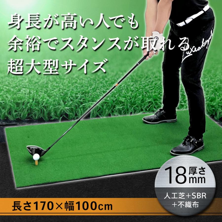 サイズは縦幅170cm×横幅100cm×厚さ18mm(人工芝10mm+土台SBRマット8mm)、カラーはグリーン、素材/材質はSBR、PP(ポリプロピレン)人工芝、セット内容は特大ゴルフマット/PUゴルフボール6個/ゴムティー3種になります。
