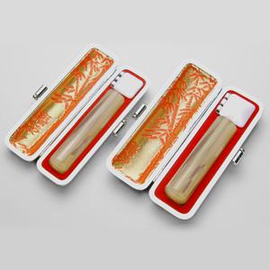 牛の角を加工した印鑑材料です。牛の角は皮膚の一部であり、主成分はたんぱく質です。当店では高級といわれる「芯持ち」という芯に最も近い部分のみを使用しています。当店では通常の牛角(色・芯持ち)三種類と、特に数少なく美しい(純白・芯持ち)といわれる高級品を扱っております。朱肉の付き具合や押印性においても非常に優れた素材で、その美しさから男性だけでなく、女性にも好まれます。【中色】は色味の濃淡のコントラストが【濃色】よりも少し弱いタイプの牛角印鑑です。【印鑑ケース付き】■印鑑サイズ 実印用:16.5mm/銀行印用:13.5mm"}