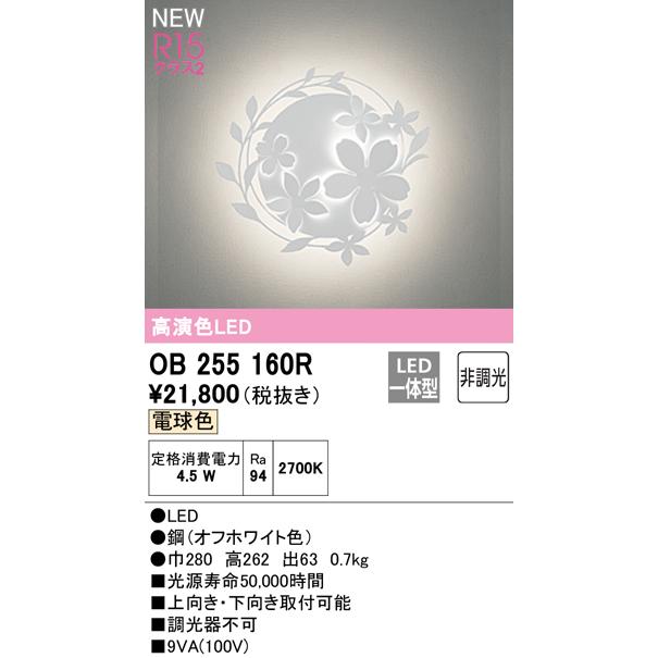 OB255160R LEDブラケットライト R15高演色 クラス2 電球色 非調光 オーデリック 照明器具 壁付け 装飾照明 おしゃれ