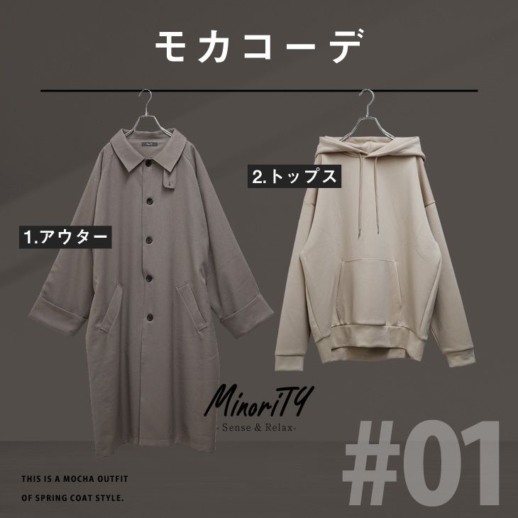 素材:≪アウター≫【表地】ポリエステル 100%【裏地】ポリエステル 100%≪トップス≫ポリエステル 79%レーヨン 14%ポリウレタン 7%【旬のスプリングコートセット】●Design/デザイン大人っぽく、垢ぬけた雰囲気を出したい方は必見のコーデセット。目玉となるロングコートは上品かつ清潔感溢れるコーデを叶えてくれる春のマストアウターです◎●モカセットのポイント♪モカのロングコートとアイボリーのパーカーを合わせ、柔らかさと知的な雰囲気を感じさせるセット。シンプルに黒のパンツを合わせるだけで、好印象間違いなしな春コーデの完成◎●チャコールセットのポイント♪シンプルかつ、より大人っぽい雰囲気を好む方にはチャコールセットがおすすめ◎コーデがモノトーンでまとまっていることで、品の良さを感じさせる組み合わせです♪