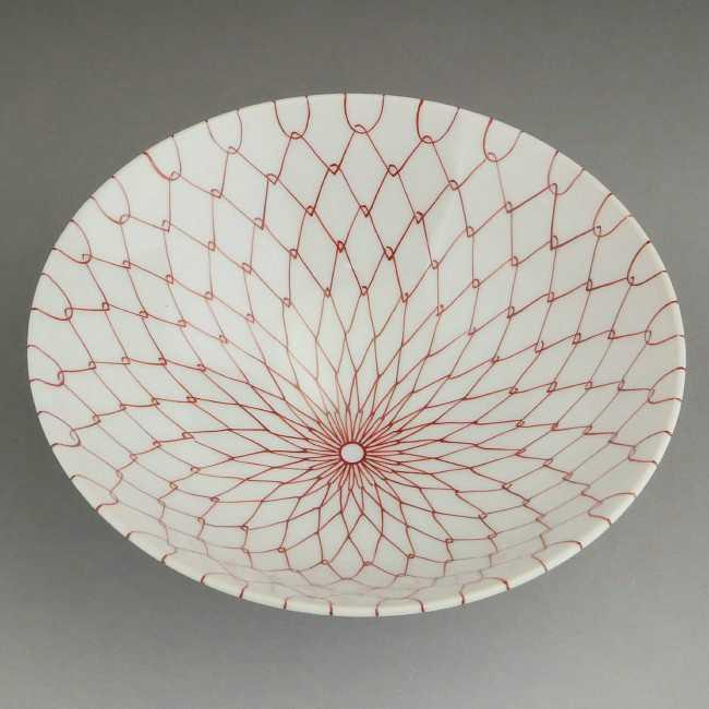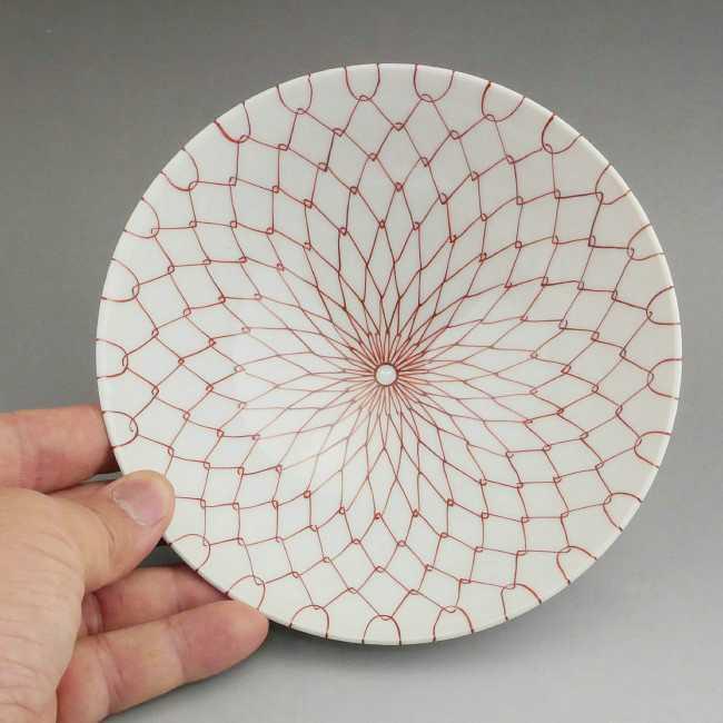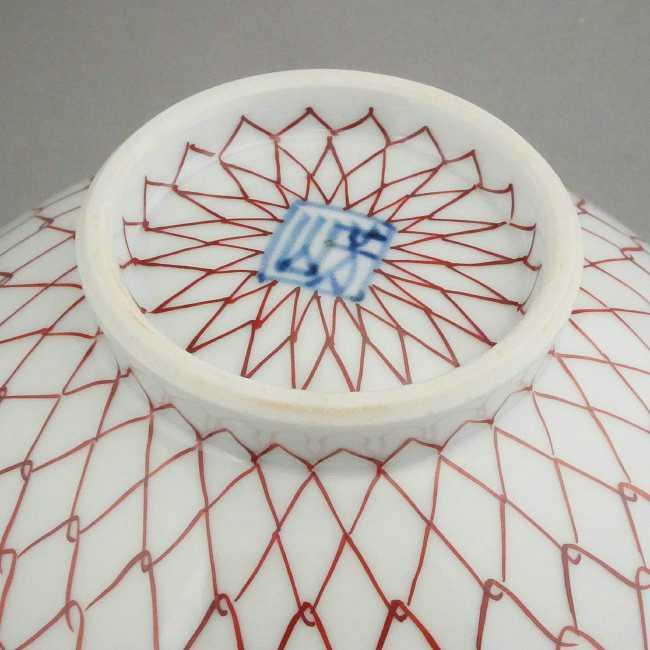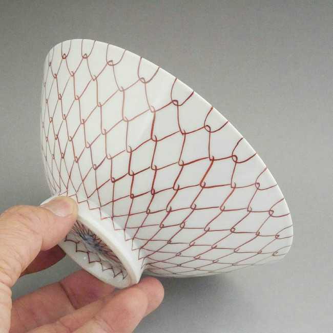 京都の京焼清水焼の窯元、芳山作の赤網目ご飯茶碗 特大のサイズです。