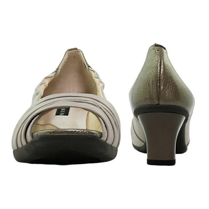 安心の日本製。“NINE DI NINE”甲の折り返しデザインがおしゃれなオープントゥパンプスです。表面はつや消しの革で、かかと部分の革パーツのエナメル調の光沢がアクセントとなっています。インソールにクッション性があり足にやさしく、リフトは減り軽減機能、消音機能、防滑機能など、嬉しい機能が満載です。□カラー:グレージュ・クロ□サイズ:22.5cm 23.0cm 23.5cm 24.0cm 24.5cm ヒールの高さ:約5.0cm ワイズ(横幅):3E(EEE)□23.5cm(2E)の女性スタッフの感想 インソールはクッション性があり歩きやすいパンプスです。 私は23.5cmが丁度よかったです。□素材 アッパー:天然皮革 ソール:合成底送料無料商品ですが、送付先が沖縄県の場合800円、北海道の場合400円の送料が発生いたします。また、離島は沖縄県の離島は800円、それ以外の地域の離島は400円の送料が発生致しますのでご了承ください。パンプス レディース NINE DI NINE No.131-7048 ナイン・デ・ナイン ワンヒール ハイヒール オープントゥ 3E EEE クッション性 消音 防滑 耐摩耗性 靴 本革 天然皮革 日本製 女性 婦人"} 商品説明 商品の特徴 安心の日本製。