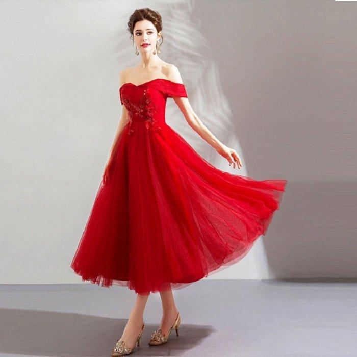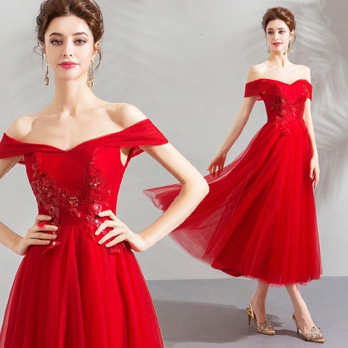 カラードレス 演奏会用ドレス パーティードレス ミモレ丈 レッド ウェディングドレス 発表会 結婚式 ピアノ 二次会 ドレス 前撮り 結婚式 花嫁 大きいサイズ