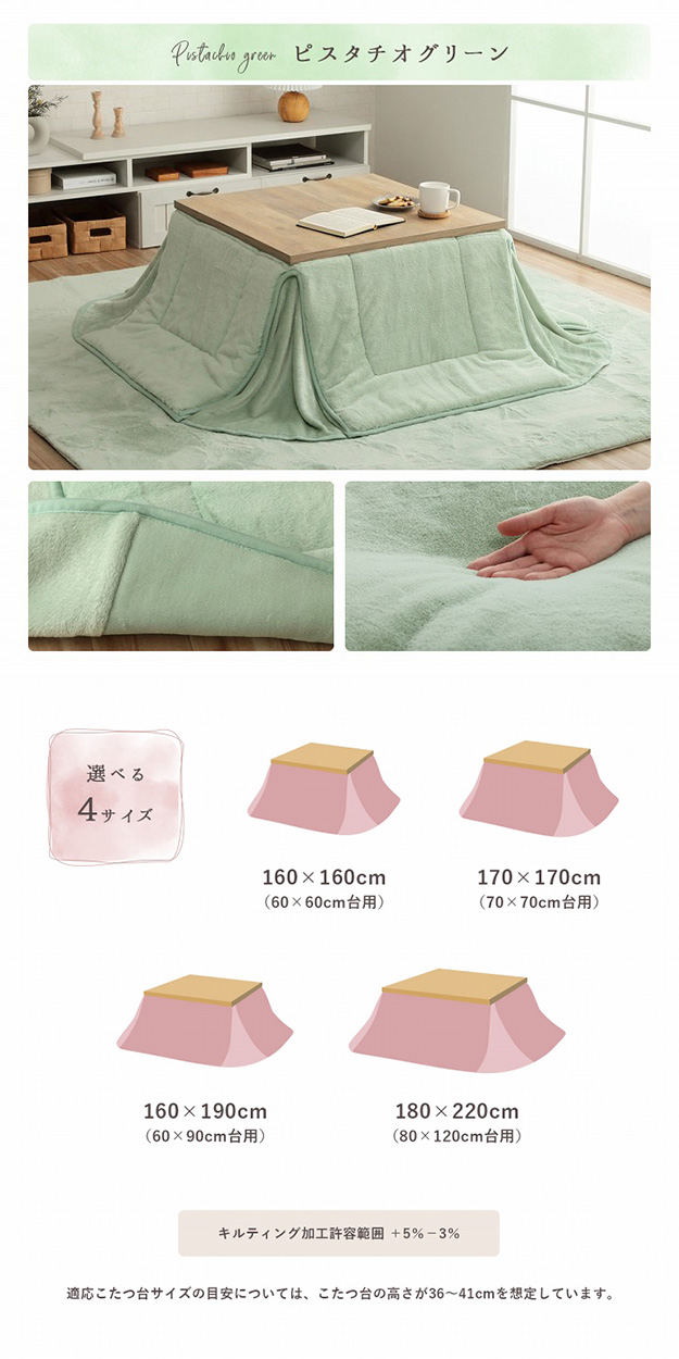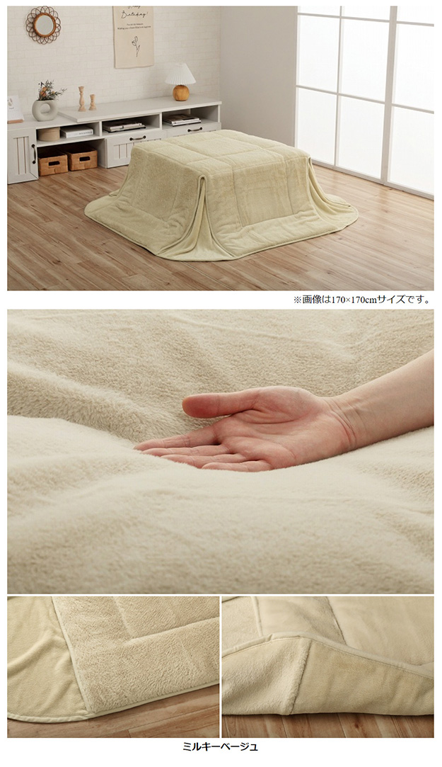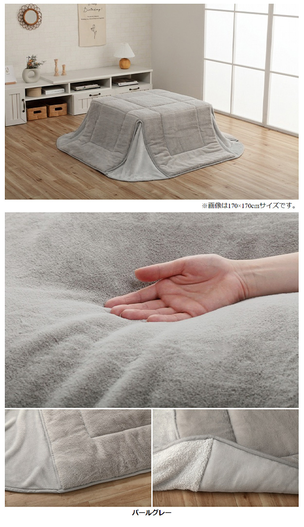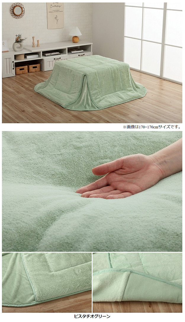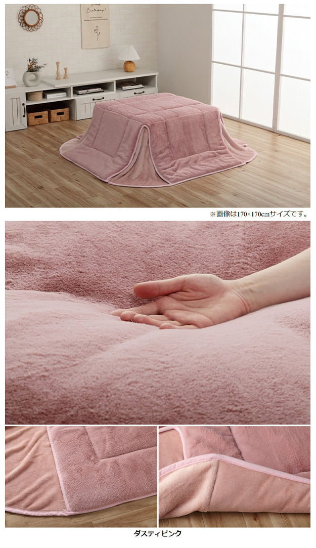 ■サイズ約170×170cm(キルティング加工許容範囲 +5%−3%)■適応こたつ台サイズ約70×70cm のこたつ台対応■組成【表地】タレ部=ポリエステル100%(フェイクファー)天板部=ポリエステル100%(フェイクファー)コーナー=ポリエステル100%(フランネル両面起毛)【裏地】タレ部=ポリエステル100%(フランネル)天板部=ポリエステル100%(ピーチスキン)【中綿】中空ポリエステル綿100%(抗菌防臭加工)■カラースノーホワイト/パールグレー/ダスティピンク/ミルキーベージュ/ピスタチオグリーン■原産国中国製■送料関東〜九州:送料無料東北:480円北海道:980円沖縄・離島:別途お見積り※商品出荷後のキャンセルはできかねます。ご了承ください。※時間指定は出来かねます。"}