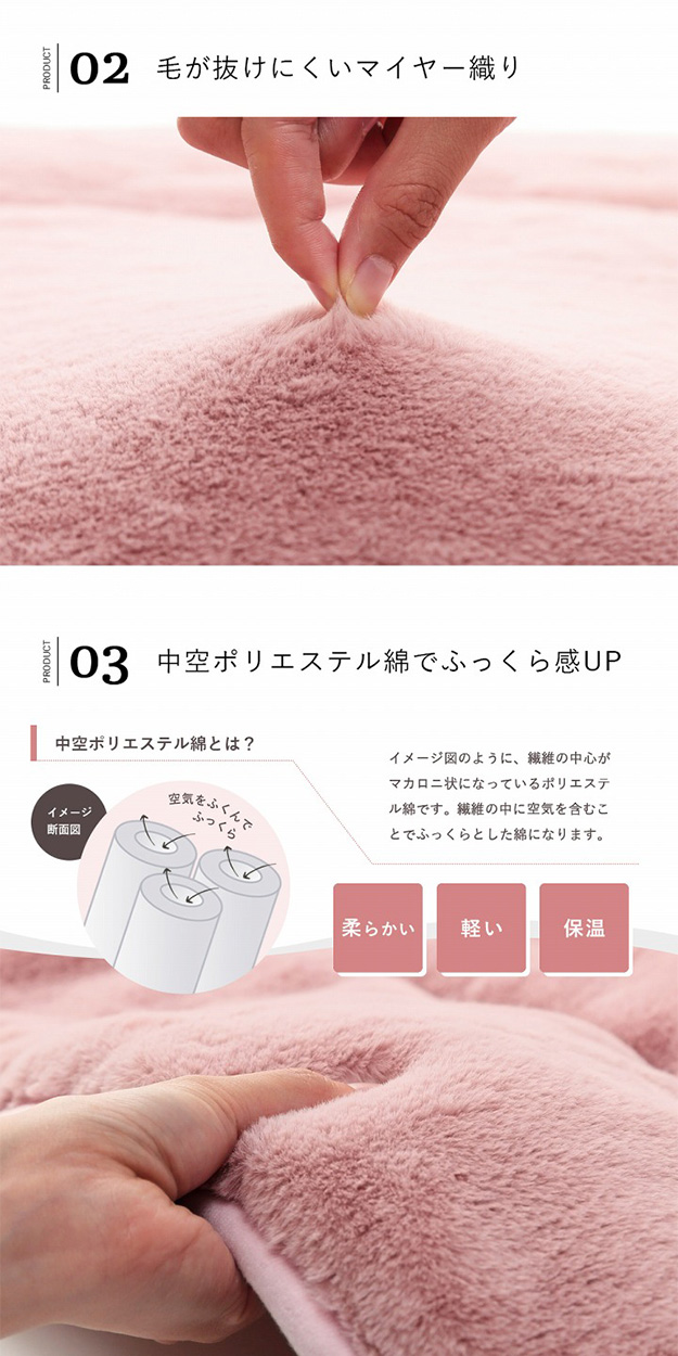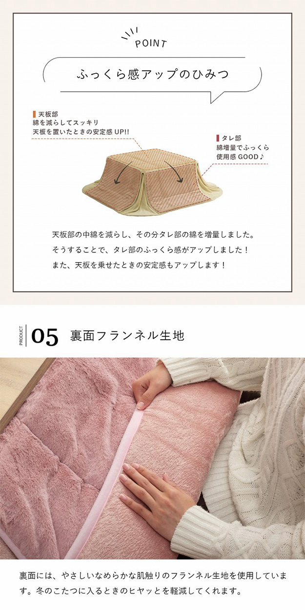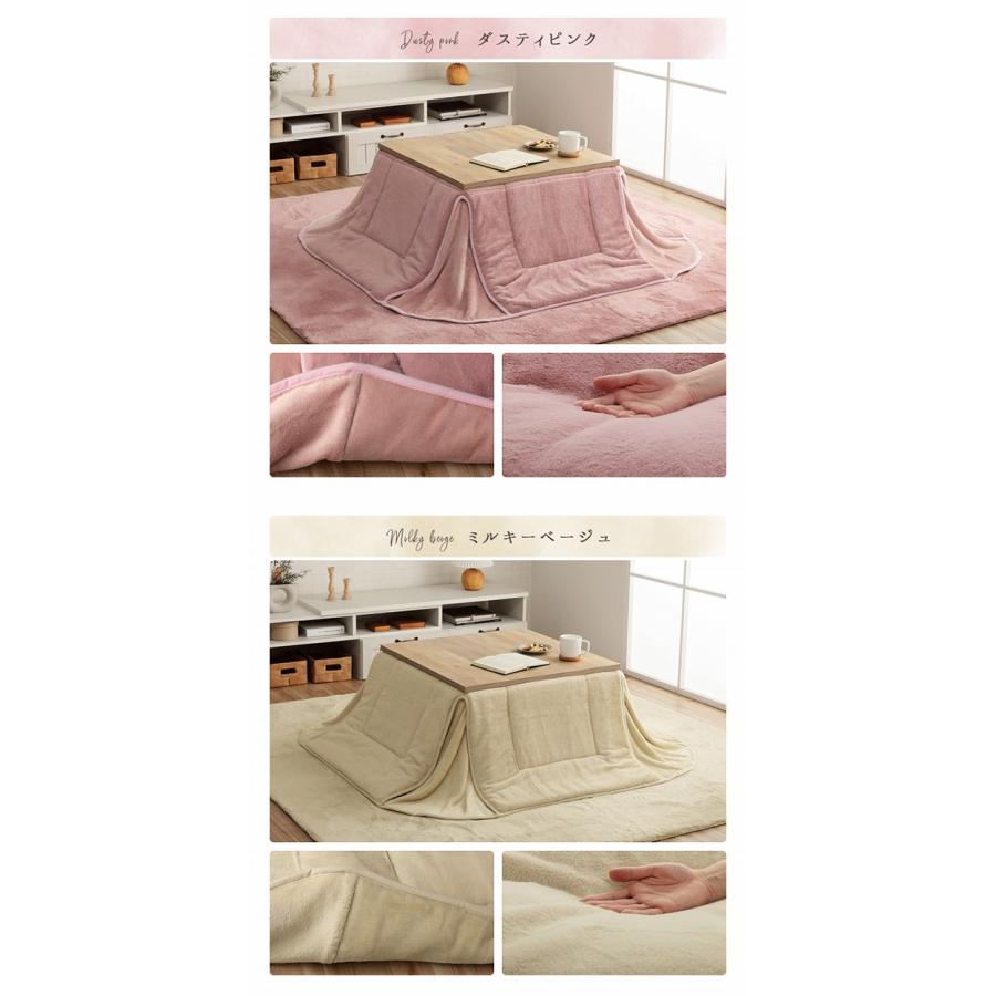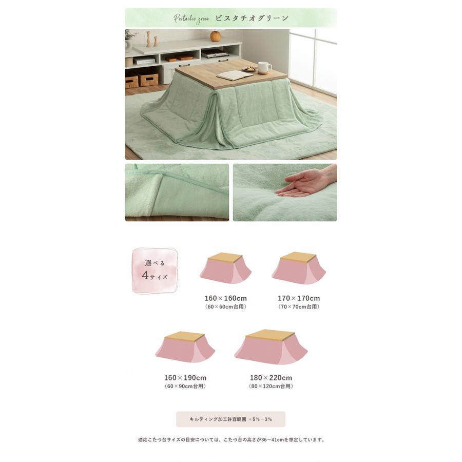 ■サイズ約170×170cm(キルティング加工許容範囲 +5%−3%)■適応こたつ台サイズ約70×70cm のこたつ台対応■組成【表地】タレ部=ポリエステル100%(フェイクファー)天板部=ポリエステル100%(フェイクファー)コーナー=ポリエステル100%(フランネル両面起毛)【裏地】タレ部=ポリエステル100%(フランネル)天板部=ポリエステル100%(ピーチスキン)【中綿】中空ポリエステル綿100%(抗菌防臭加工)■カラースノーホワイト/パールグレー/ダスティピンク/ミルキーベージュ/ピスタチオグリーン■原産国中国製■送料関東〜九州:送料無料東北:480円北海道:980円沖縄・離島:別途お見積り※商品出荷後のキャンセルはできかねます。ご了承ください。※時間指定は出来かねます。"}