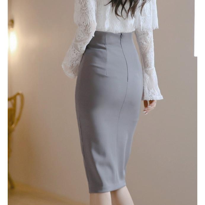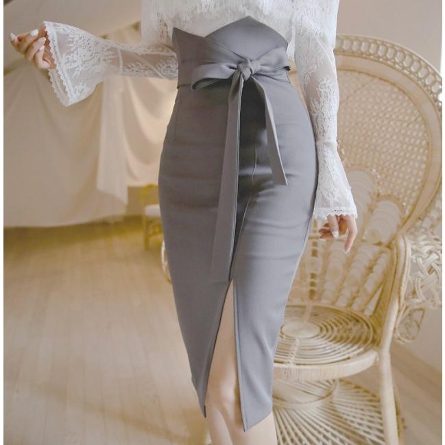 前スリット ハイウエスト スカート タイト 膝下 タイトスカート 膝丈 スリット レディース ボトムス ウエストマーク ウエストリボン オフィス