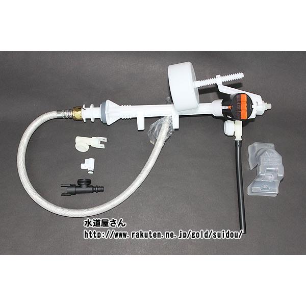 | ■ | 取付け方法 | まず止水栓をマイナスドライバーで水を止めタンク水を排水します。タンク内のガイドやストッパー等を外し止水栓部で接続ホースを外します。本体は反時計廻りに45度ひねるとロックが外れ、上に引き抜けます。本体を説明書に記載のタンク仕様にして逆の手順で組み立てます。タンクを外す必要はありません。