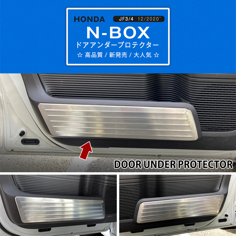 ★内容適合車種:ホンダ・N-BOX JF3/4 2020年12月〜枚数:本体4枚色合:シルバー素材:ステンレス★商品特徴簡素なデザインですがないとは大違い!インテリアの見栄えが断然良くなります!ドアの下側はより蹴りつくところなので、傷つきやすいです。お車に装着するだけで傷防止と傷隠しに使える!ステンレス素材なので、防錆、耐熱、耐久性が優秀!車種専用設計なのでフィッテング抜群!★取付方法一度仮合わせして、位置の調整を行ってください。貼り付く際は、接着面の油分や汚れを十分に落としてください。後で強力両面テープで貼るだけの簡単取付です。※十分に接着させるために、装着後丸1日は走行・洗車などしないでください。キーワード:HONDA N-BOX NBOX 前後期共通 2017年〜 2020年~ 内装プロテクター インテリアパネル ドアアンダーパネル 内装モール キックガード サイドドアパーツ インテリアパーツ 内装モール サイドドアアンダープロテクター カスタムパーツ カーパーツ 高級感アップ 傷防止 アクセサリー ドレスアップ カー用品 傷隠し 専用設計 キズ防止