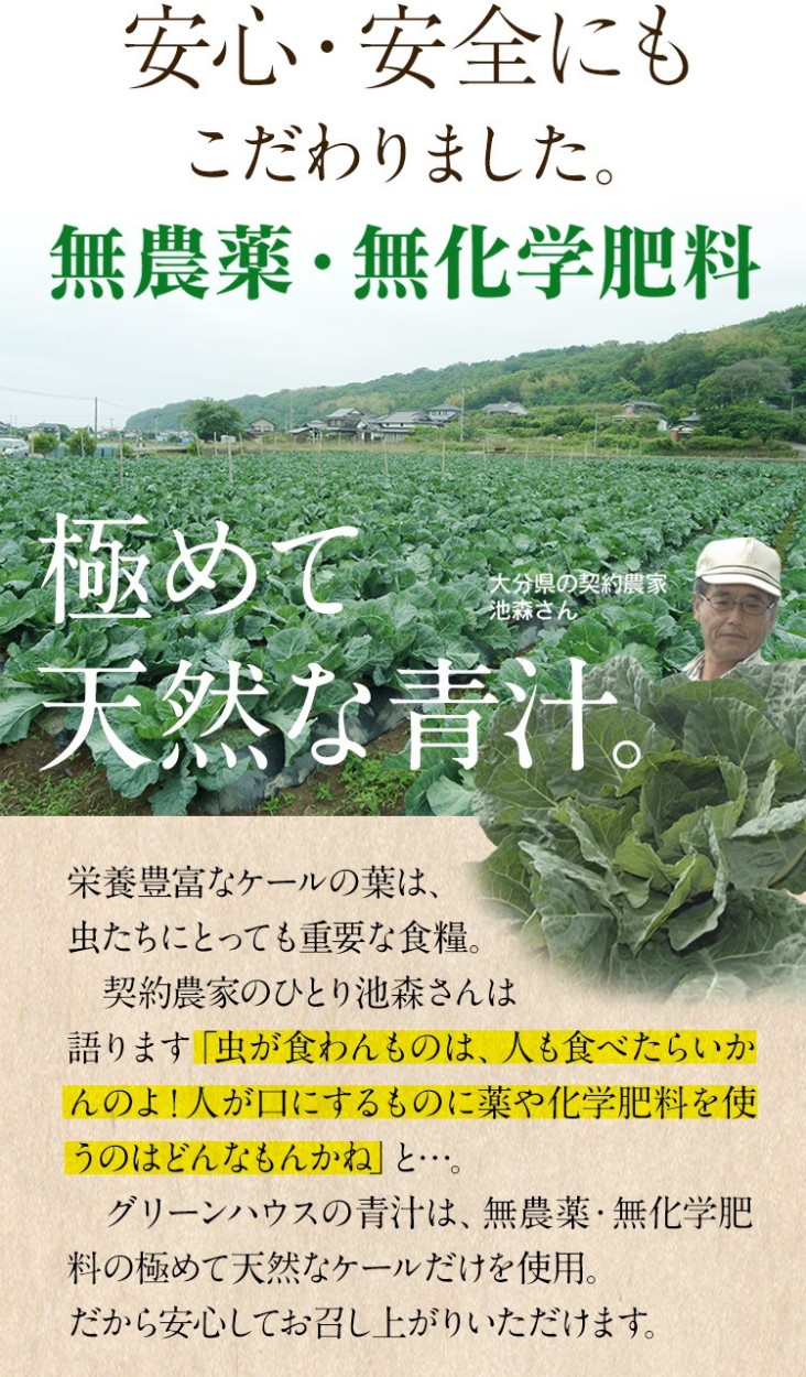 ・健康数値が気になる方・野菜不足が気になる方・お子様の健やかな成長に「野菜の王様」ケールの青汁!キャベツやブロッコリーの原種・ケールを75%使用した国産ケールの青汁。朝採れケールをそのまますぐに搾汁し、余分な食物繊維を外してスプレードライしているので、水にサッと溶けて喉越しも良く、シェイカーで混ぜると生野菜をジュースにしたときと同じように酵素成分が泡立ちます!この泡が新鮮な青汁の証なのです!余分な食物繊維を排除しているので、その分1袋あたりのビタミンやミネラル、葉酸等の栄養もたっぷり!毎日の健康維持にぜひお役立てください。ケール青汁なのに飲みやすいスッキリレモン味!レモン果汁を配合しているため、小さなお子様にもごくごくお飲みいただけます♪冷水や炭酸水と混ぜたり、ヨーグルトと混ぜたスムージーもオススメです!☆成人に必要な1日分のビタミンC(80mg)がレモンの青汁1杯(2袋)で摂れます。☆無農薬・化学肥料不使用関連キーワード:スーパーフード,レモンの青汁,ケール,Kale,ロカボ,ビーガン,野菜不足,葉酸,ビタミンK,ビタミンU,ミネラル,酵素