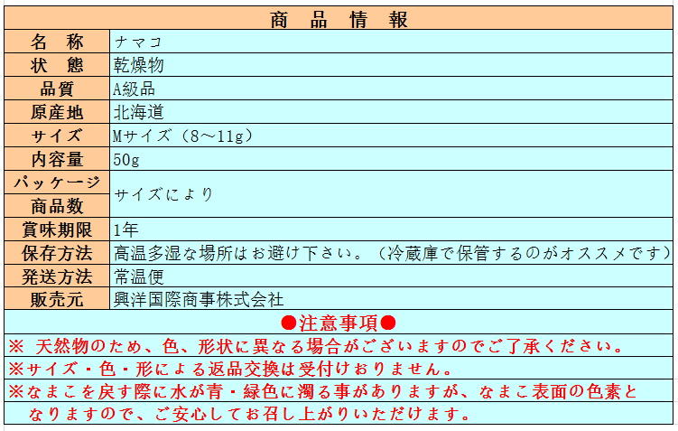 ■名 称: ナマコ■状 態: 乾燥物■品 質: A級品■原産地: 北海道■内容量: 50g■サイズ: Mサイズ(8〜11g)■商品数: サイズにより■賞味期限:1年■保存方法:高温多湿の場所は避けて下さい■発送方法:常温便■販売者: 興洋国際商事株式会社■なまこの効果:★腫瘍細胞の成長を抑制する★組織細胞の老化を抑える★免疫力の調整能力がある★骨髄赤細胞の成長を刺激し、再生不良性貧血の改善に明らかな効果がある★抗疲労作用がある【注意事項】※こちらの商品は「メール便」でのお届けとなります。 ※お届け先のポストに投函にて配達完了となります。※き、配達日時指定はご利用いただけません。発送からお届くまで1-2日程かかります。■自然物の為、形状、色に若干の異なる場合がございますのでご了承ください。■なまこを戻す際に水が青・緑色に濁る事がありますが、なまこ表面の色素となりますので、ご安心してお召し上がりいただけます。「関連ワード」【なまこ ナマコ 干しナマコ 干しなまこ 黒なまこ 金ん子 海鼠 刺参 namako 淡乾海参 栄養品 北海道産乾燥ナマコ 激安ナマコ 】"}