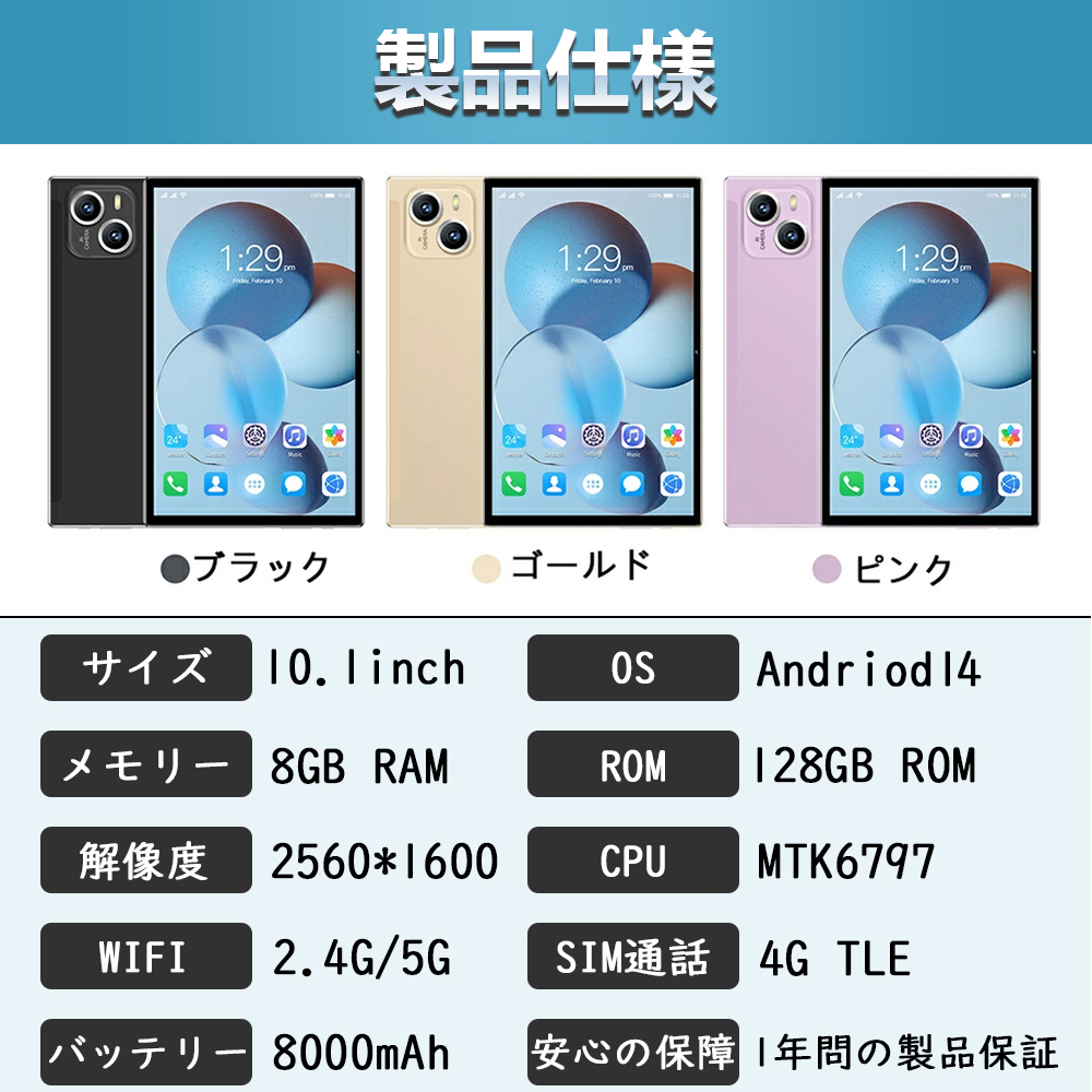 OS:Android 14製品サイズ :242mm*152mm*0.69mm液晶サイズ:10.1 インチ解像度:2650*1600picCPU:MTK6797カメラ:フロント(24MP) リア(48MP)RAM/ROM容量:RAM 8GB/ROM 128GB(microSDカード別売、最大128GBが追加可)無線:IEEE 802.11 ac/a/b/g/n2.4GHz/5GHzGPS:衛星 GPS対応SIMサイズ:Mini-SIM言語:日本語含めマルチ言語■商品特徴Wi-Fi、Bluetooth、GPS、通話等の多機能付き安価SIMフリータブレットですプレゼント/お祝い/ギフト/贈り物/誕生日/オンライン授業/在宅勤務/テレワーク一部商品はアプリ(YouTube/Netflix等々)が視聴できない理由について:※製品の使用体験はお客様が注文した型番によって異なります。一部のアプリはバージョンがサポートされていないため、インストールや使用エラーが発生する可能性があります。※有線LAN接続できません。上記"}