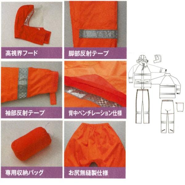 ☆全方位型プリズム反射テープ付きのレインスーツです!☆雨の日も輝度が落ちにくく、汚れに強いプリズム反射テープを使用しております!☆夜間の外作業時や交通整理時に効果的です。☆裏地がメッシュになっており、ベタ付きを防止します。☆耐水圧10000mmH2O、透湿性2000g/m2です。☆袖口はゴムシャーリング+マジックテープアジャスターにより雨の進入を防ぎます。☆フードは取り外し式で視界を確保する透明ツバ付きです。☆首元までのフルジッパー仕様。☆ジャケットの裾には絞り用の引き紐付きです。☆左右腰部分にフラップ付きポケットが付いています!☆持ち運びに便利な収納袋付きです。☆1万円以上のお買上げで送料無料、手数料無料となります。 素材・色・サイズ 【素材】表:ポリエステル100%(PUコーティング)/ 裏:ポリエステル100%メッシュ【色】063オレンジ 008ネイビー 019イエロー【サイズ】3L/4L"} レインスーツ(562404)