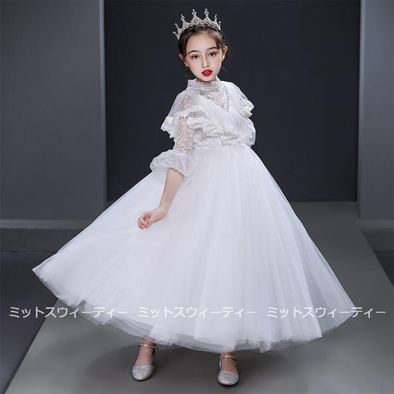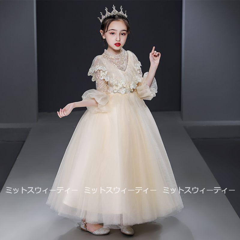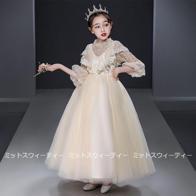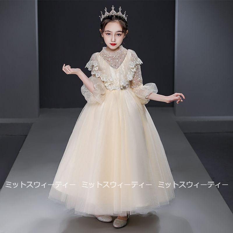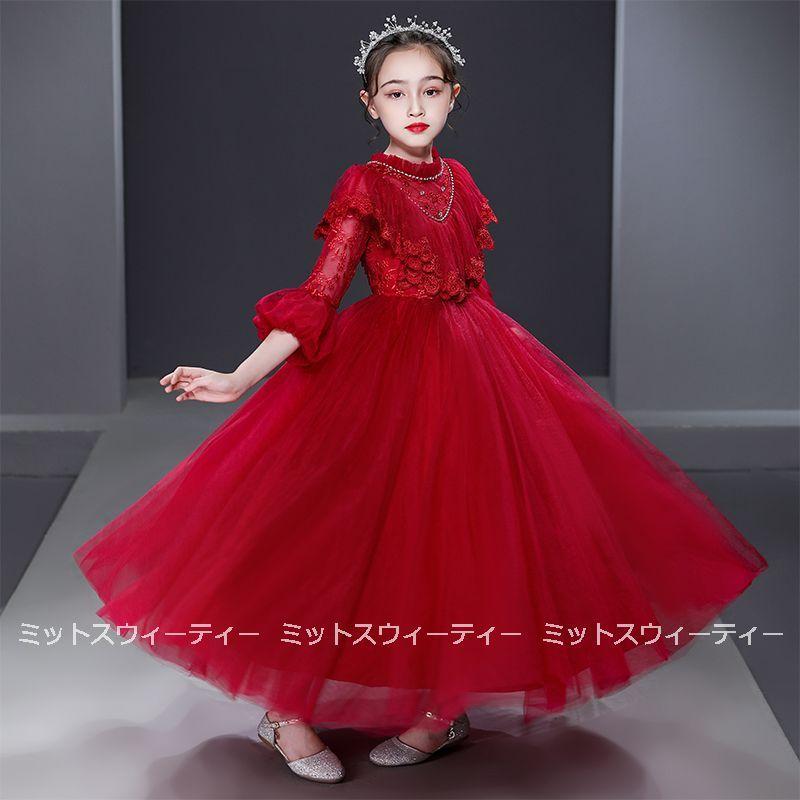 ピアノ発表会 子供ドレス シャンパン ホワイト レッド ロングドレス キッズドレス 女の子 フォマールドレス ガールズ ワンピース 長袖 フリル チュール お姫様