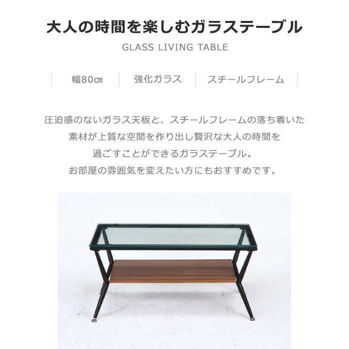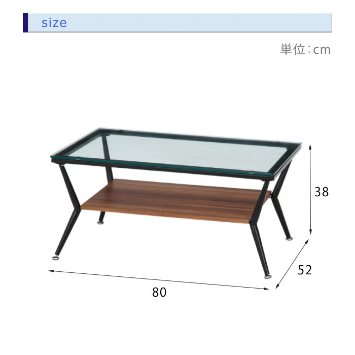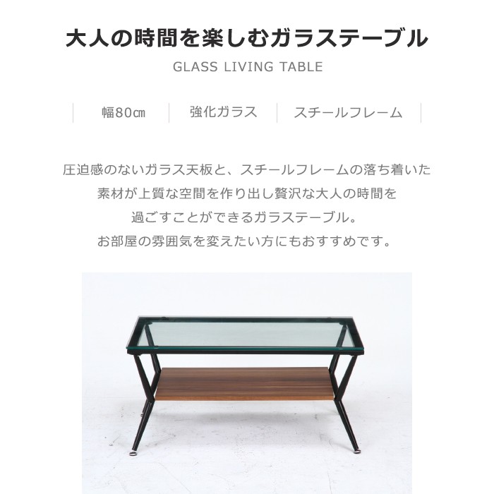 サイズ(約):幅80×奥行52×高さ38cm材質:[天板] 強化ガラス8mm、[脚部] スチール(粉体塗装)重量:約14kg組立て:お客様組立て-----------------[商品の説明]デザイン性に優れた、落ち着いた雰囲気のガラステーブル。本や雑誌、リモコンなどを置ける便利な収納棚付き。アジャスター付きで、ガタつきや高さの微調整ができます。