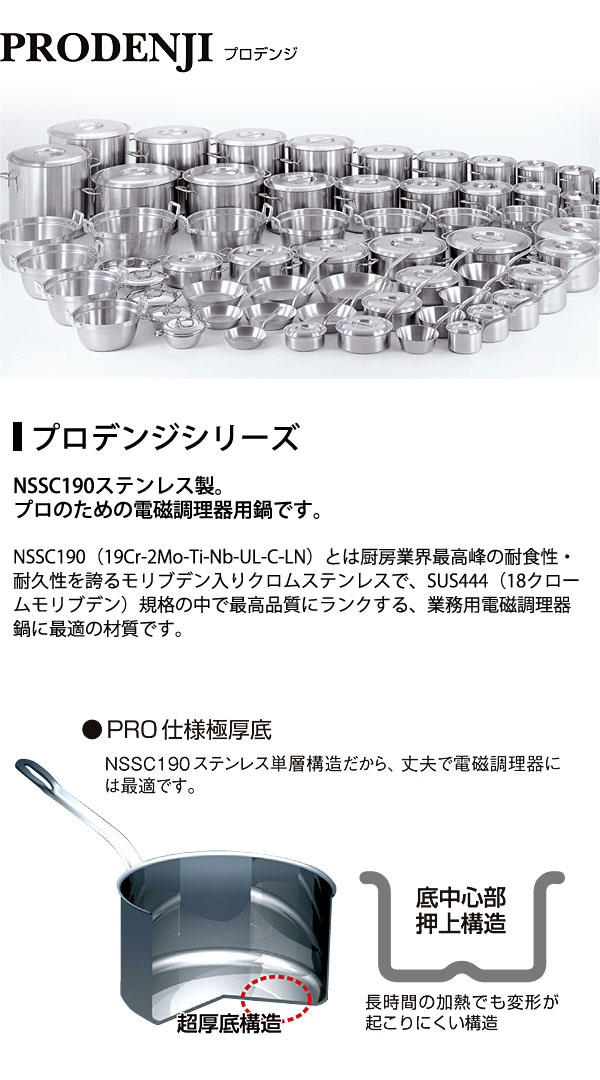 【業務用厨房機器のキッチンマーケット】本間製作所プロデンジ チリ鍋 仕切り付 21cm規格(容量) : [21cm(1.1L)]内径 深さ t=底板厚 : φ210×H60mm t=2.0mm材質 : SUS444(NSSC190)NSSC190ステンレス製。プロのための電磁調理器用鍋です。NSSC190(19Cr-2Mo-Ti-Nb-UL-C-LN)とは厨房業界最高峰の耐食性・耐久性を誇るモリブデン入りクロムステンレスで、SUS444(18クロームモリブデン)規格の中で最高品質にランクする、業務用電磁調理器鍋に最適の材質です。●PRO仕様極厚底NSSC190ステンレス単層構造だから、丈夫で電磁調理器には最適です。長時間の加熱でも変形が起こりにくい構造"}