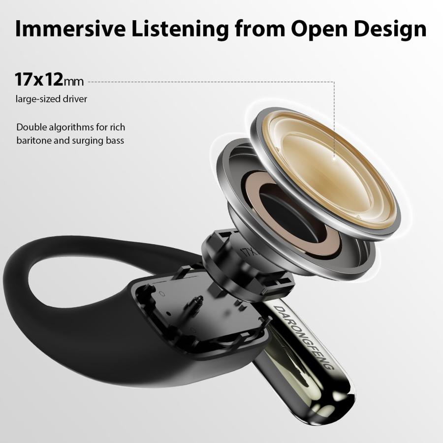全国送料無料。海外倉庫から国内に取り寄せますので、お届けまで2-3週間程度お時間頂いております。また、税関審査により、開封による外箱の損傷の可能性が稀にございますが、商品自体の品質は問題ございませんのでご安心ください。国内到着後に一度検品して発送させて頂きます。商品についてご不明な点がございましたら、「この商品について問い合わせ」ボタンからお気軽にお問い合わせください。(商品が電波法上の技術基準に適合する必要がある無線機器の場合:商品は並行輸入品でございますので、電波法上の技術基準に適合いたしません。日本国内で使用すると電波法に違反するおそれがありますのでご購入、ご使用には十分ご注意ください)日本語名DARONGFENG オープンイヤーワイヤレス Bluetooth ヘッドフォン、LED デジタルディスプレイ充電ケース付き痛みのない気導イヤホン、ランニング、安全運転、長時間の日常使用に耐汗性英語名DARONGFENG Open Ear Wireless Bluetooth Headphones, Pain-Free Air Conduction Ear Buds with LED Digital Display Charging Case, Sweat Resistant for Running, Safe Driving, and Extended Daily Use"} ・Superior Sound Performance】17*12mm large size driver speaker & bio-l diaphragm providing full and rich air-conduction audio. With a mid-low frequency enhancement algorithm, these earbuds deliver a well-balanced audio output, creating an immersive audio experience.