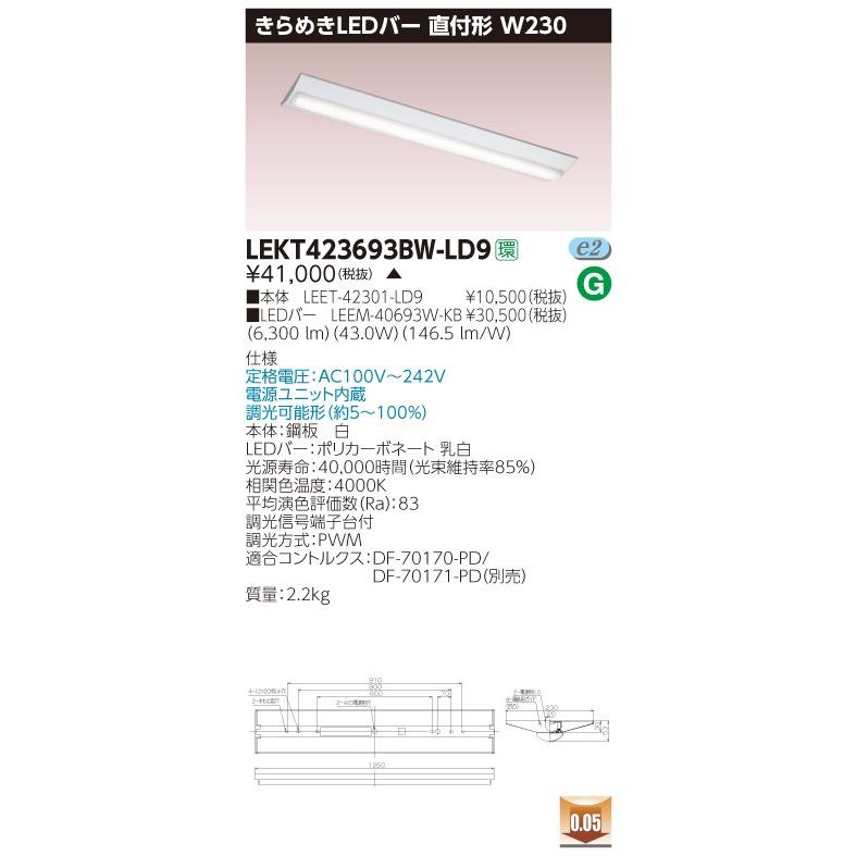 LEKT423693BW-LD9 LEDベースライト 40タイプ 直付形(富士型) W230 きらめきLEDバー 6900lmタイプ(Hf32形×2灯用 高出力形相当) 白色 連続調光 東芝ライテック