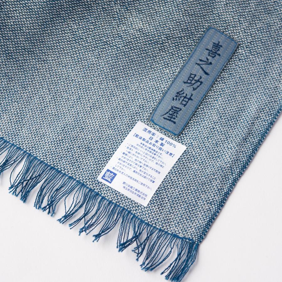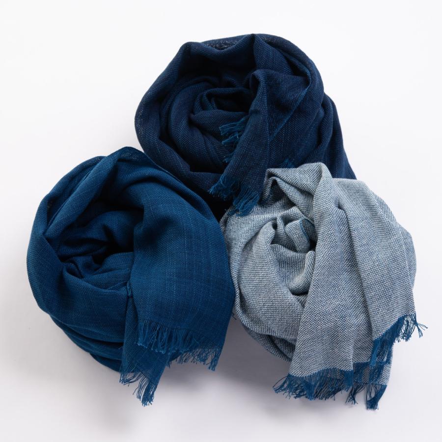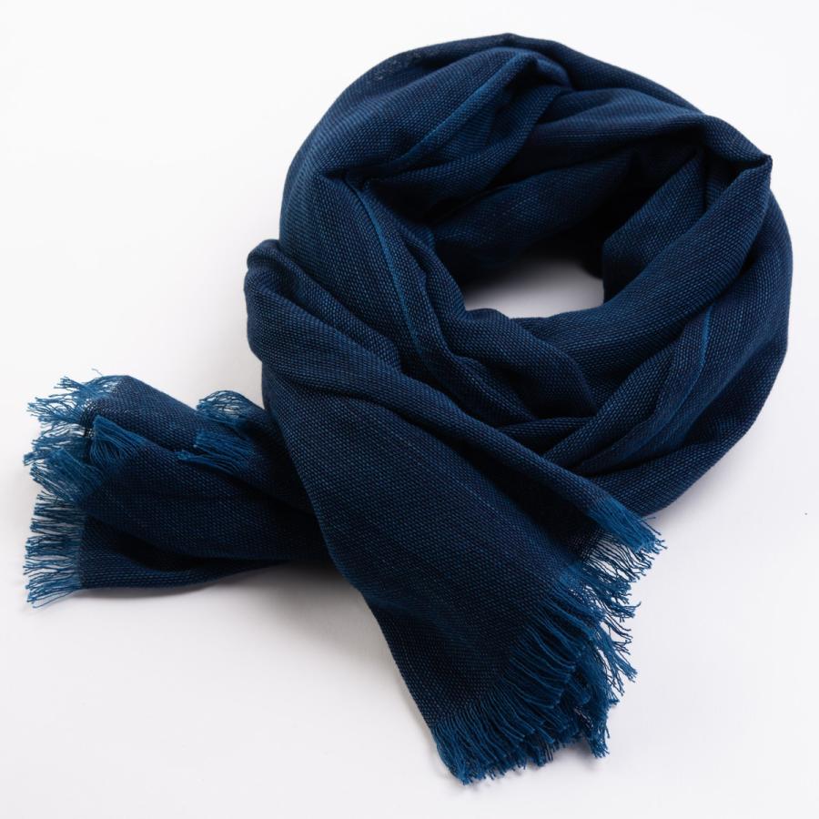 【代々受け継がれてきた藍染め技術はほっこりする柔らかな手触り】野川染織の藍染め技術を受け継ぐ「喜之助紺屋」ブランドの『藍の先染め織物 青縞ストール』をお届けします。青縞ストールは藍で染めた糸を柔らかく織りあげたストールで、極上の肌触りと風合いが特徴の「青縞」体験ができる逸品です。日本で藍染が庶民の間に定着したのは江戸時代だと言われています。中でもよく知られるのは「青縞」です。「青縞」は江戸時代後期に農家の副業として始まった藍染めの綿織物で、糸を染めた後、布に織り上げるため、糸の染まり具合の違いによって縞柄のように見えることからこう呼ばれています。野川染織では、化学的、人工的な力を一切借りず、代々受け継がれた藍染め技法で自然の力だけで染料に変えているので、肌の弱い人にも安心して身につけていただくことができると喜ばれています。"}