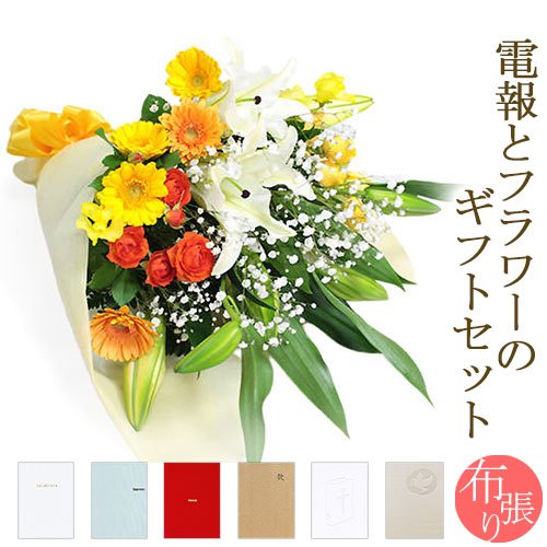 花束「ユリと季節の花束・暖色系」と「布張りカード電報」のセット【主な用途】電報 祝電 お祝い電報 結婚式 誕生日 お祝い文例【大切な方へ贈るギフト】結婚祝い 結婚式 ウェディング ブライダル お誕生日 結婚記念日 銀婚式 金婚式 出産祝い 快気祝い 退院祝い お見舞い ギフト プレゼント 贈り物【季節のお祝いへ贈るギフト】お年賀 成人式 成人の日 バレンタインデー チョコ以外 ホワイトデー 合格 入学祝い 卒業祝い 就職 入学式 入園式 卒業式 卒園式 母の日 父の日 敬老の日 孫の日 クリスマス【ビジネスなどのお祝いギフト】開店祝い 開業祝い 開院 就任祝い 昇進 栄転 事務所移転 竣工式 落成式 送迎会 送別祝い 退職祝い 退官 選挙 当選 叙勲 褒章 受章 受賞 表彰 創立 周年 記念パーティー 出版 新築祝い 引越し祝い 発表会 演奏会 公演 楽屋見舞い【長寿のお祝いに贈るギフト】還暦祝い 古希 喜寿 傘寿 米寿 卒寿 白寿 百寿 賀寿 長寿祝い"}