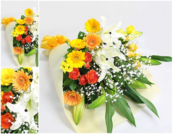 優雅で大人の香りが魅力の白いユリをメインフラワーに、暖かみのある黄色・オレンジの暖色系の季節のお花を添えて花束にしました。結婚式、お誕生日、ご退職のお祝い、発表会のお祝いなどにも最適です。