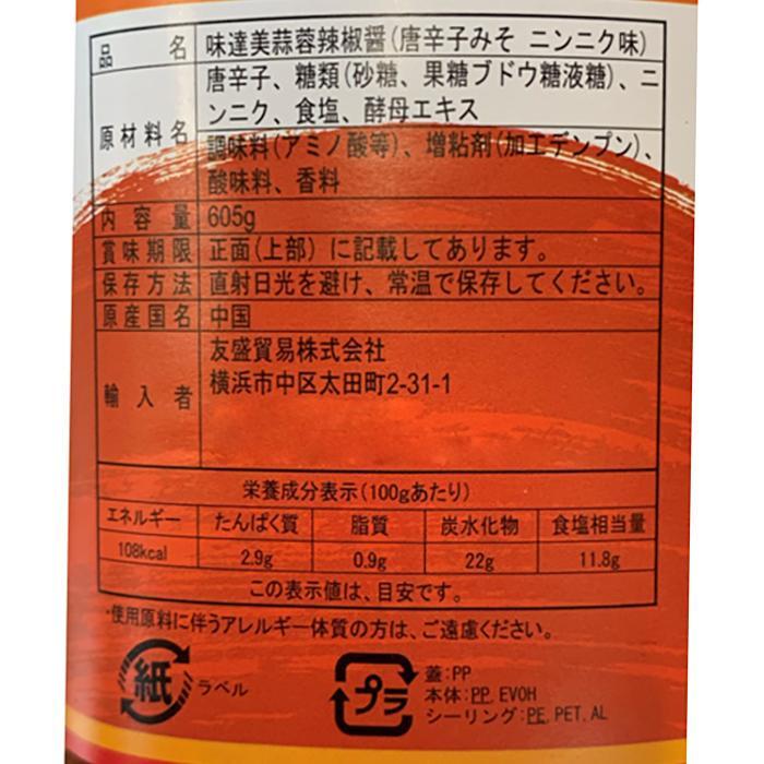 味達美蒜蓉辣椒醤(唐辛子ミソ)605g×15本 210190 唐辛子みそです。 生産国:中国 賞味期間:540日 蒜蓉辣椒醤です! キーワード【食品 調味料 料理の素 油 中華 エスニック調味料】