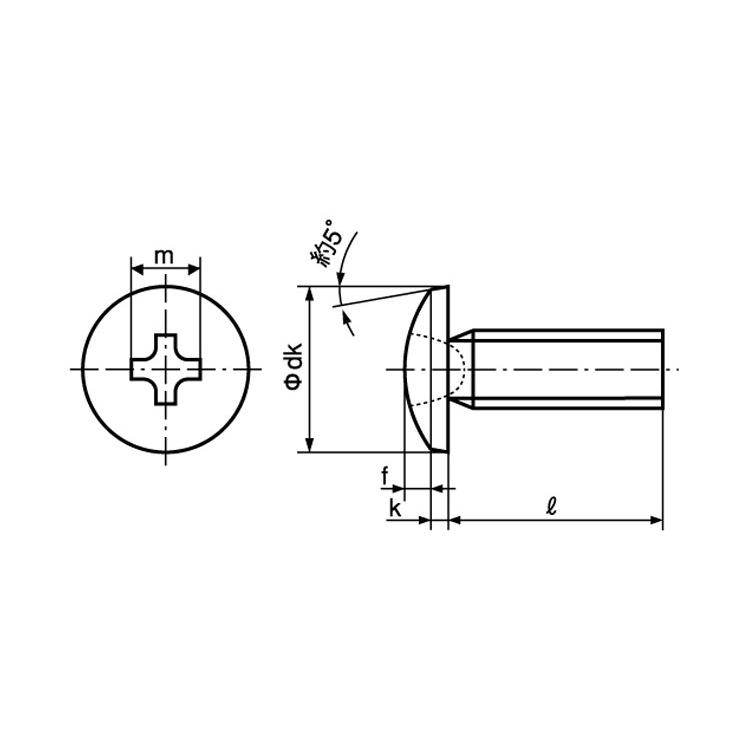 頭が台形で、上面に丸みがつけられています。同じ呼び径のなべ小ねじに比べて、1.1〜1.2倍ていど頭の径が大きくなっています。材料に対して接地面を大きくすることができるので、座面の陥没を防ぐ効果があります。トラスでは頭部の径が大きすぎる場合に使われることもあり、なべと同様に幅広く使うことができる小ねじです。頭径が大きいので、座面の陥没を防ぐ効果があるほか、締め付ける材料の取り付け穴を隠すのにも便利です。なべ小ねじより、ややスマートな印象があるため、見た目で選んでもよいでしょう。"}