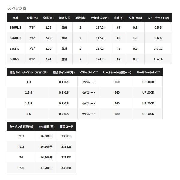 ◆S76UL-S喰わせのオールラウンダー。S76UL-Sはタフコンディションに対して非常に有利。しなやかかつ高強度なソリッド[タフテックα]を採用することで、S76UL-Tに比べ明らかにティップの硬さを落としてあります。重量のあるリグが苦手となる反面、軽量なリグとの相性は格別です。漁港、港湾、防波堤などのスレ切った魚を相手に、アンダー1gのジグヘッドの使用も余裕でこなします。《お取り寄せ》商品に関しまして、お待ち頂ける方は予約受付致します/ご連絡下さい。