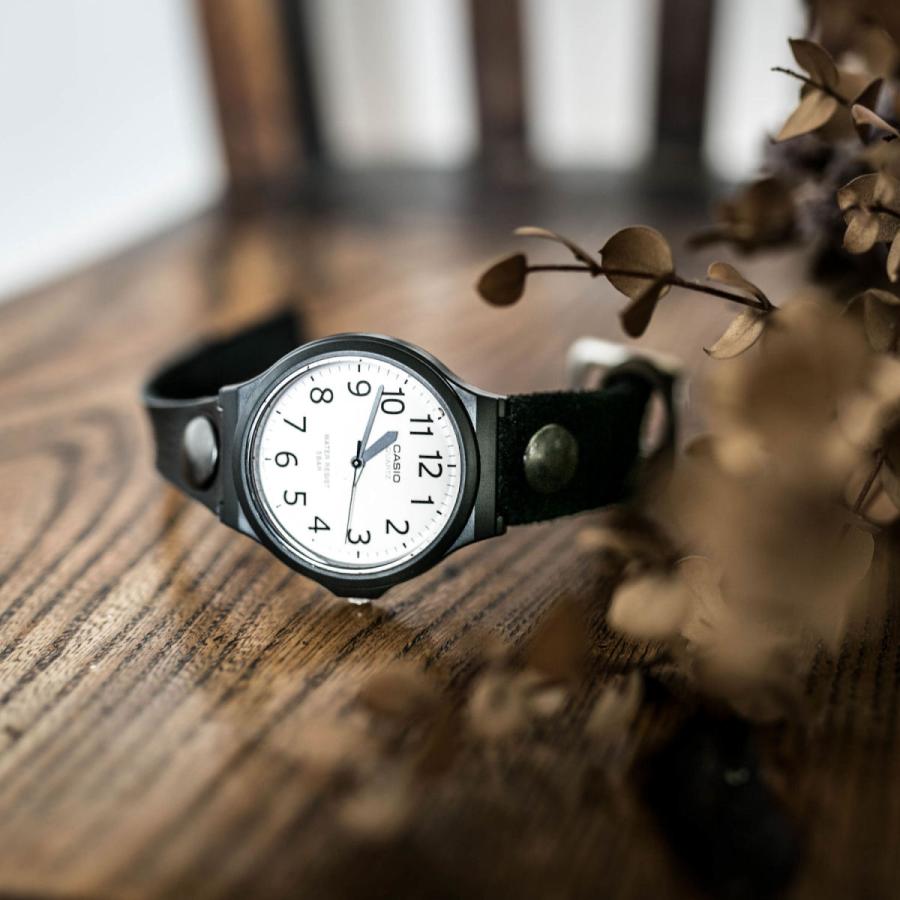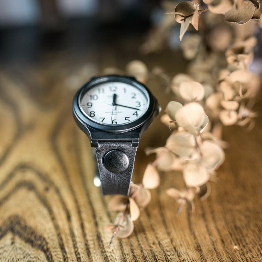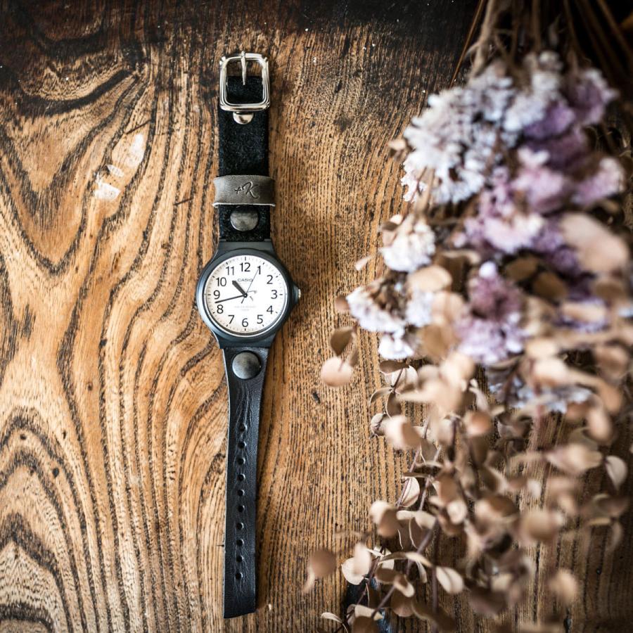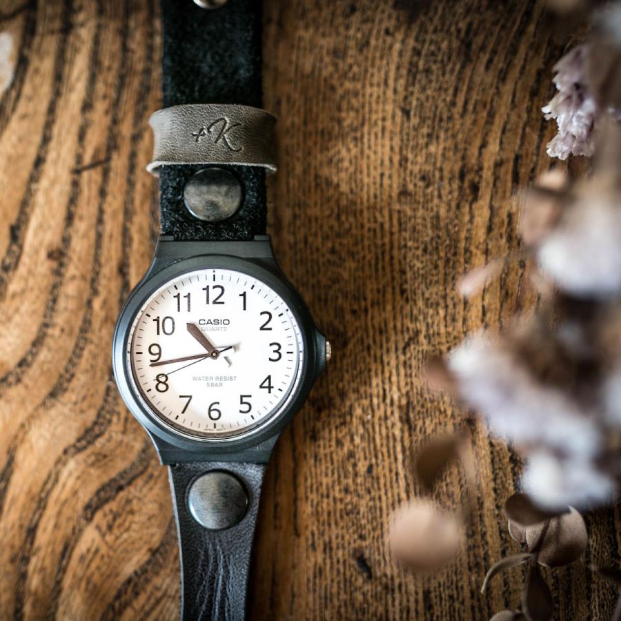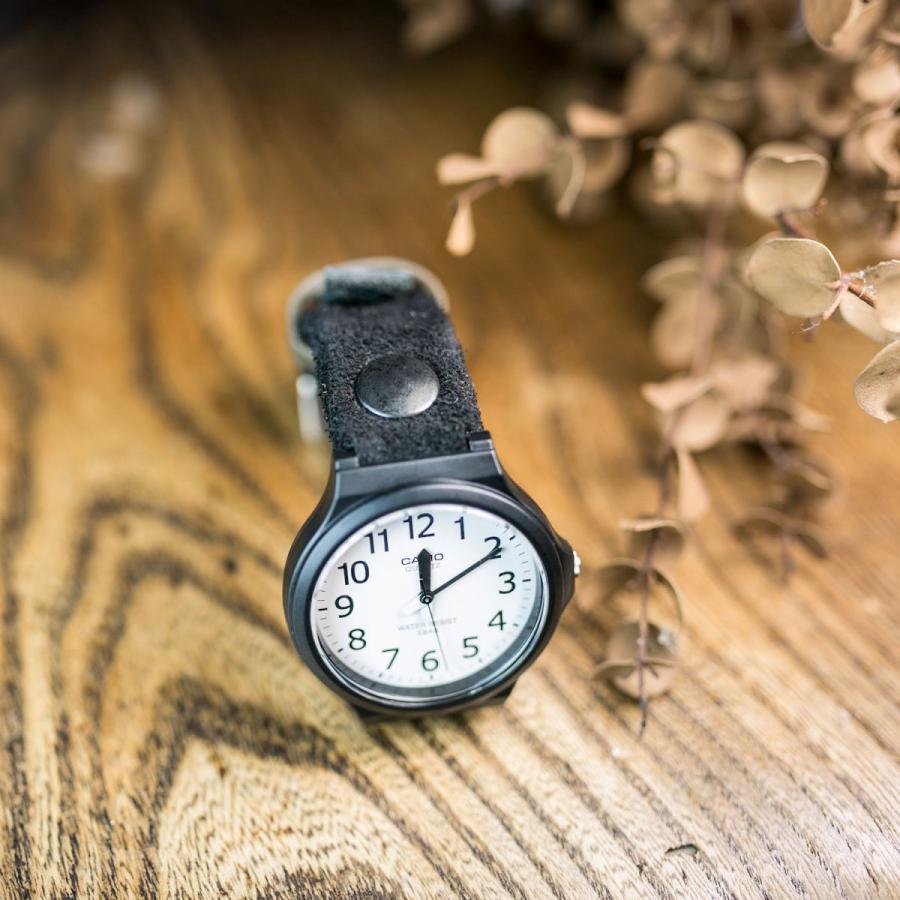 80"s/90"sレトロデザイン腕時計シンプルな作りでとても見易くて評判のカシオヴィンテージ/チプカシを、くったりした質感の本革スウェード/ベロアと、ヴィンテージ加工を施したシンプルな本ヌメ革で、デザインした2トーン腕時計全体のカラーをオールレトロブラックで統一感を出し、ベルト部はスエードとヌメ革、それぞれ個性的なアシンメトリへアレンジメンズ・レディース問わず男女どちらでも使用可能にデザイン致しました。革 / スウェードレザー 起毛させたベロア革 柔軟でくったりした質感が特徴 / ヌメ革 ヴィンテージ加工を施した本ヌメ革 適度な腰感と耐久性が特徴時計本体 / カシオ 文字盤直径4cm 電池寿命約3年 / 5気圧防水 取説付きユニセックス / 男女兼用 バックルにて調整可能シルバー反りバックル / 日常の取外し易い反りバックル仕様重量 / 約40g"}